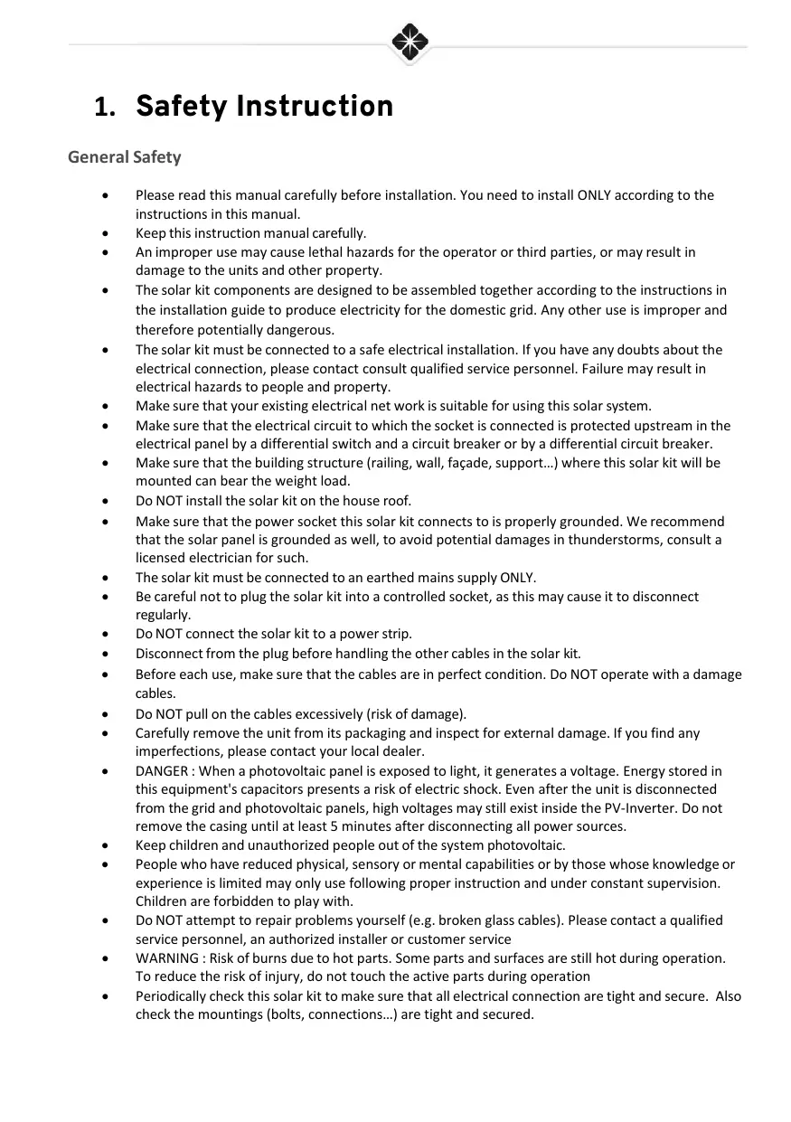 General Safety + Please read this manual carefully before installation. You need to install ONLY according to the instructions in this manual. + Keepthis instruction manual carefully. + Animproper use may cause lethal hazard for the operator or third parties, or may result in damage to the units and other property. + The solar kit components are designed to be assembled together according to the instructions in the installation guide to produce electricity for the domestic grid. Any other use is improper and therefore potentially dangerous. + The solar kit must be connected to a safe electrical installation. If you have any doubts about the electrical connection, please contact consult qualified service personnel. Failure may result in electrical hazards to people and property. + Make sure that your existing electrical net work is suitable for using this solar system. + Make sure that the electrical circuit to which the socket is connected is protected upstream in the electrical panel by a differential switch and a circuit breaker or by a differential circuit breaker. + Make sure that the building structure (railing, wall, façade, support...) where this solar kit will be mounted can bear the weight load. + Do NOT install the solar kit on the house roof. + Make sure that the power socket this solar kit connects to is properly grounded. We recommend that the solar panel is grounded as well, to avoid potential damages in thunderstorms, consult a licensed electrician for such. + The solar kit must be connected to an earthed mains supply ONLY. + Be careful not to plug the solar kit into a controlled socket, as this may cause it to disconnect regularly. + DoNOT connect the solar kit to a power strip. + Disconnect from the plug before handling the other cables in the solar kit. + Before each use, make sure that the cables are in perfect condition. Do NOT operate with a damage cables. + Do NOT pull on the cables excessively [risk of damage). + Carefully remove the unit from its packaging and inspect for external damage. If you find any imperfections, please contact your local dealer. + DANGER : When a photovoltaic panel is exposed to light, it generates a voltage. Energy stored in this equipment's capacitors presents a risk of electric shock. Even after the unit is disconnected from the grid and photovoltaic panels, high voltages may still exist inside the PV-Inverter. Do not remove the casing until at least 5 minutes after disconnecting all power sources. + Keep children and unauthorized people out of the system photovoltaic. + People who have reduced physical, sensory or mental capabilities or by those whose knowledge or experience is limited may only use following proper instruction and under constant supervision. Children are forbidden to play with. + Do NOT attempt to repair problems yourself (e.g. broken glass cables). Please contact a qualified service personnel, an authorized installer or customer service + WARNING : Risk of burns due to hot parts. Some parts and surfaces are still hot during operation. To reduce the risk of injury, do not touch the active parts during operation + Periodically check this solar kit to make sure that all electrical connection are tight and secure. Also check the mountings (bolts, connections...) are tight and secured.