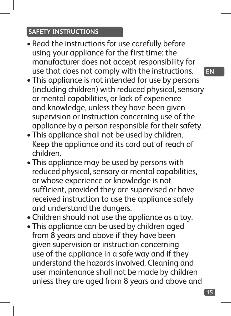 - Read the instructions for use carefully before using your appliance for the first time: the manufacturer does not accept responsibility for use that does not comply with the instructions. (NE This appliance is not intended for use by persons (including children) with reduced physical, sensory or mental capabilities, or lack of experience