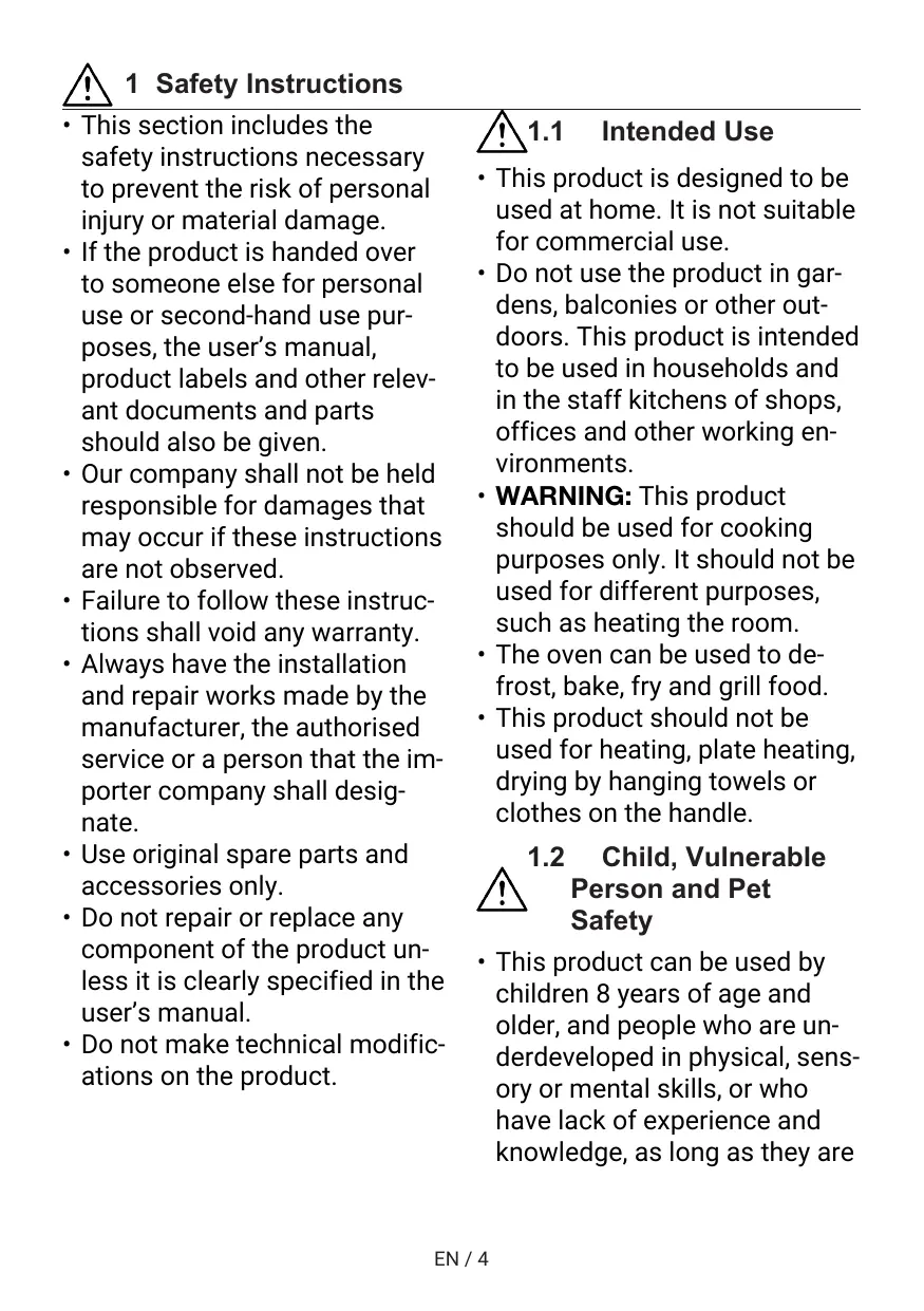 1 Safety Instructions. 4 1.1 intended Use... … 4 1.2 Child, Vulnerable Person and Pet 4 Safety. 1.3 Electrical Safety. 5 1.4 Transportation Safety 6 1.5 Installation Safety. 7 1.6 Safety of Use 7 1.7 Temperature Warnings . 8 1.8 Accessory Use. 8 1.9 Cooking Safety 8 1.10 Steam System. 9 1.11 Maintenance and Cleaning Safety 10 1.12 High temperature self-cleaning 11 (Pyrolysis) 2 Environmental Instruction: 11