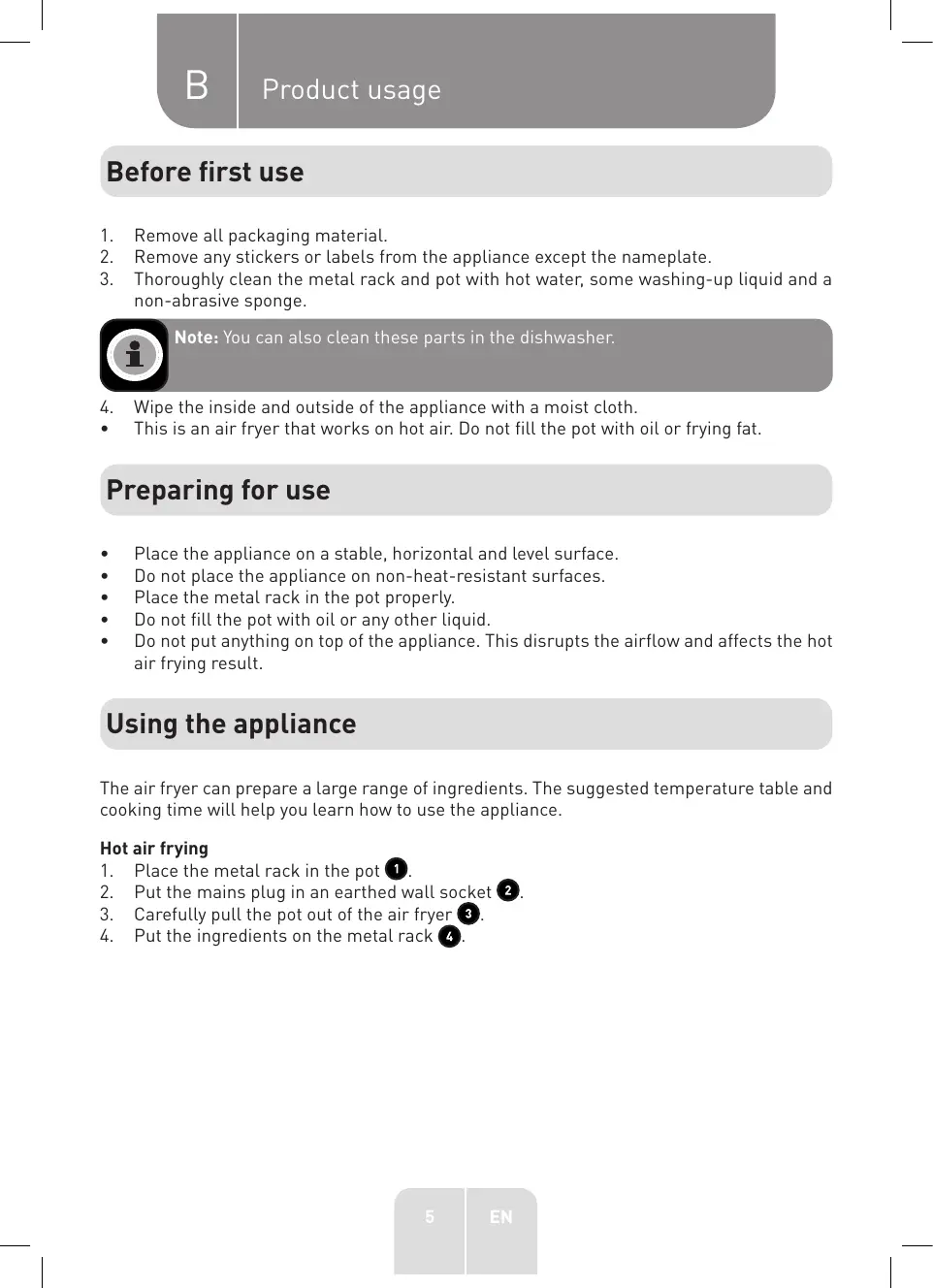 + Thisis an air fryer that works on hot air. Do not fill the pot with oil or frying fat. Preparing for use Place the appliance on a stable, horizontal and level surface. Do not place the appliance on non-heat-resistant surfaces. Place the metal rack in the pot properly. Do not fill the pot with oi or any other liquid. Do not put anything on top of the appliance. This disrupts the airflow and affects the hot air frying result. Using the appliance The air fryer can prepare a large range of ingredients. The suggested temperature table and cooking time will help you learn how to use the appliance. Hot air frying