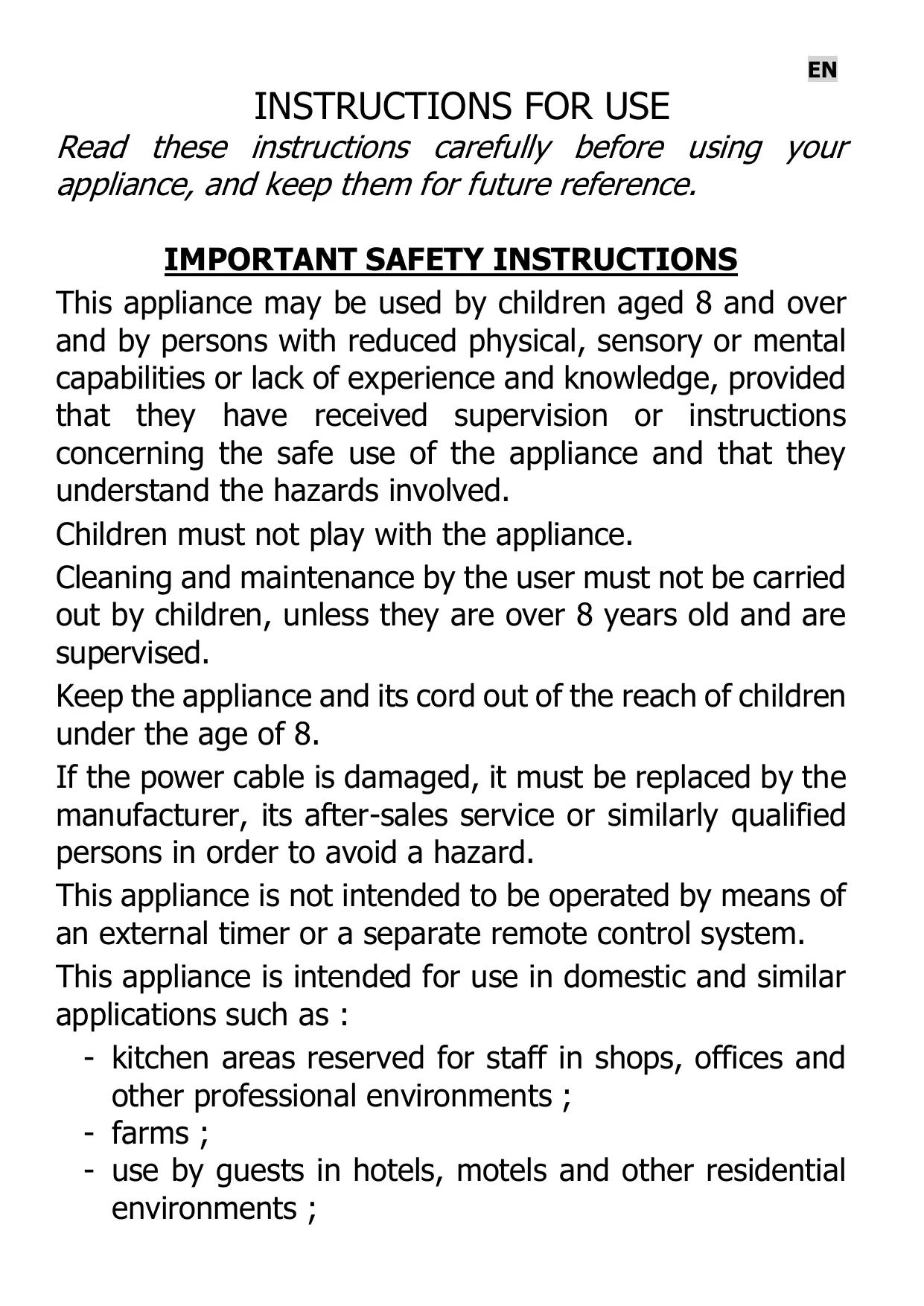 • After use, store the appliance in a dry place. - This product must not be connected to an external timer or remote control system.