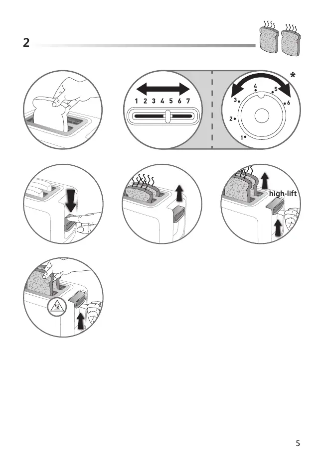 + Ifthe bread jams in the slots after toasting and the elements do not switch off, unplug the plug immediately and wait for the appliance to cool before attempting to remove the bread.