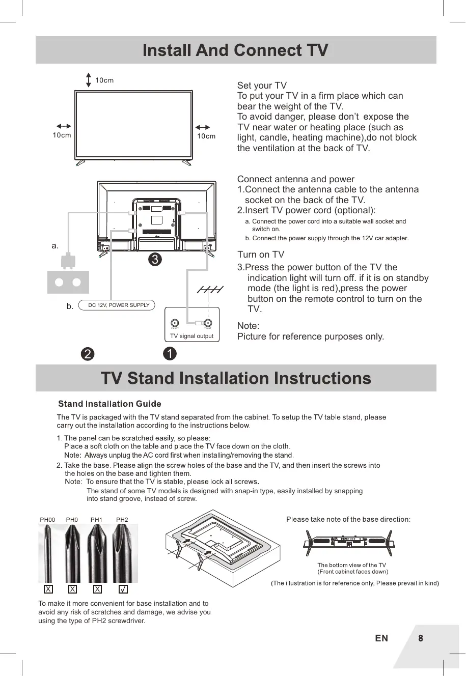 î 10cm Set your TV To put your TV in a firm place which can bear the weight of the TV.