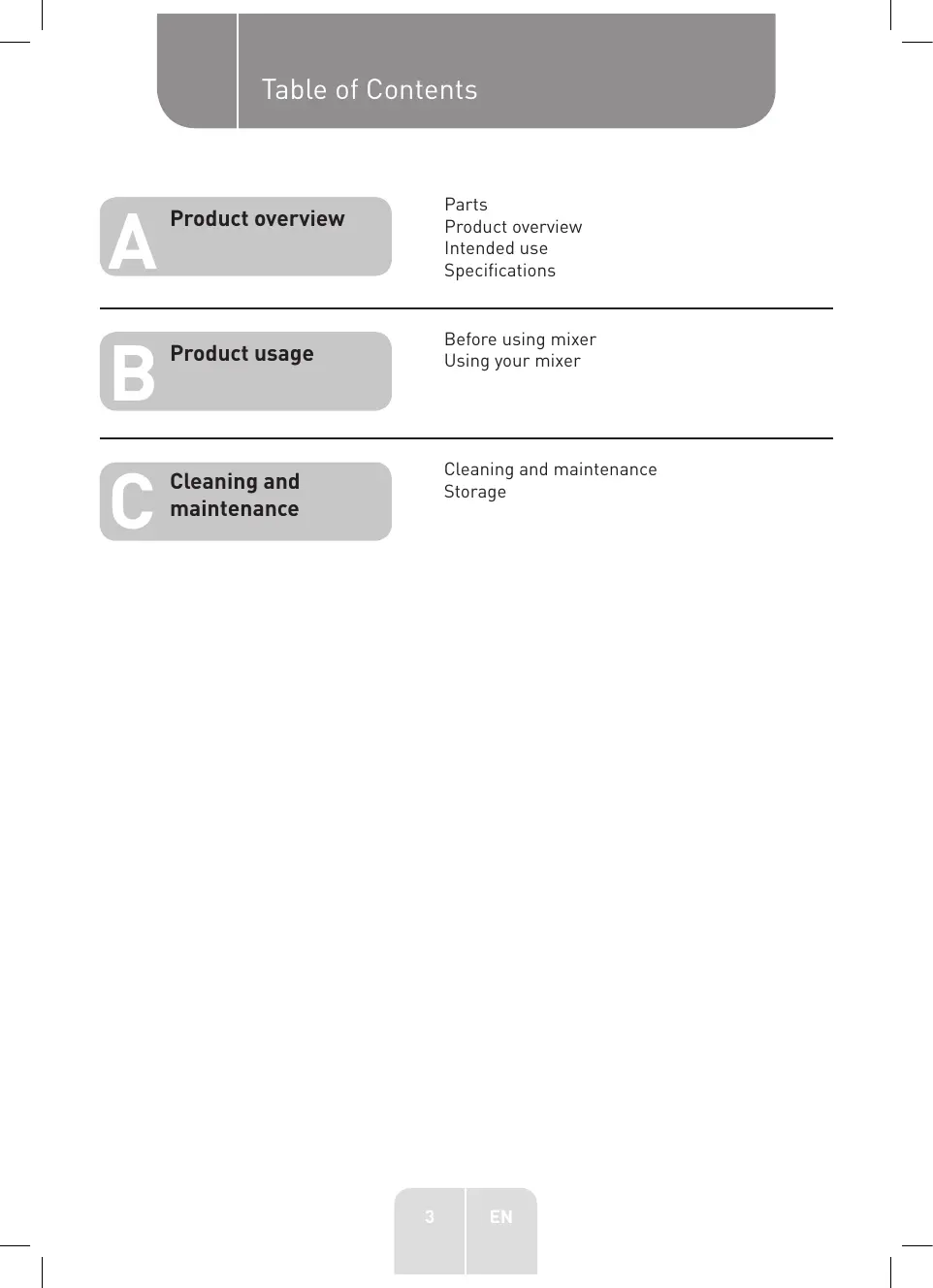 ble of Contents Parts Product overview Intended use Specifications Before using mixer Using your mixer Cleaning and maintenance Storage