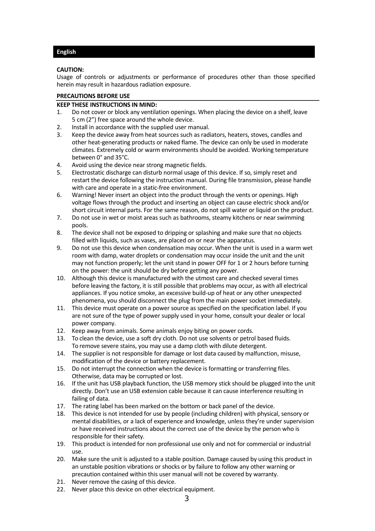 Vérifiez que l’appareil est en position stable. La garantie ne couvre pas les dégâts occasionnés par l’utilisation de cet appareil en position instable, par les vibrations, les chocs ou par la non- observation de tout autre avertissement ou précaution contenus dans ce mode d’emploi.