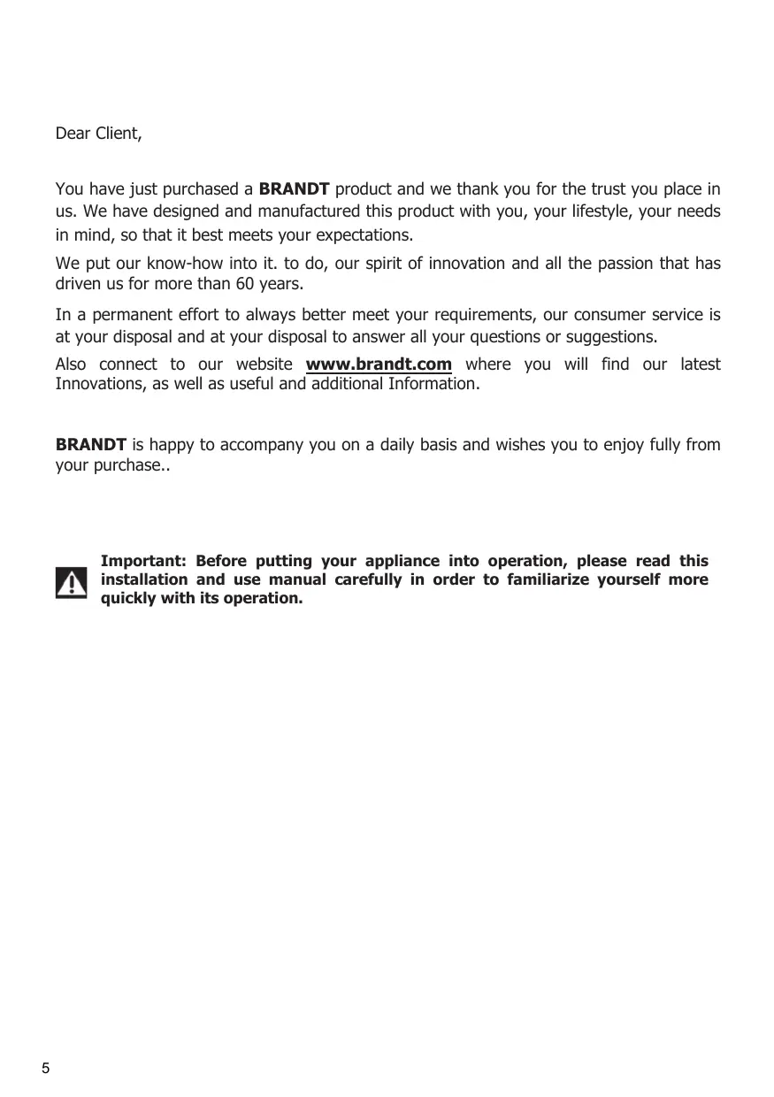 You have just purchased a BRANDT product and we thank you for the trust you place in us. We have designed and manufactured this product with you, your lifestyle, your needs in mind, so that it best meets your expectations.