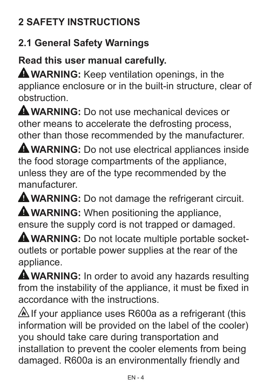 Read this user manual carefully. À WARNING: Keep ventilation openings, in the appliance enclosure or in the built-in structure, clear of obstruction. À WARNING: Do not use mechanical devices or other means to accelerate the defrosting process, other than those recommended by the manufacturer. À WARNING: Do not use electrical appliances inside the food storage compartments of the appliance, unless they are of the type recommended by the manufacturer. À WARNING: Do not damage the refrigerant circuit. À WARNING: When positioning the appliance, ensure the supply cord is not trapped or damaged. À WARNING: Do not locate multiple portable socket- outlets or portable power supplies at the rear of the appliance. À WARNING: In order to avoid any hazards resulting from the instability of the appliance, it must be fixed in accordance with the instructions. AI your appliance uses R600a as a refrigerant (this information will be provided on the label of the cooler) you should take care during transportation and installation to prevent the cooler elements from being damaged. R600a is an environmentally friendly and EN -4