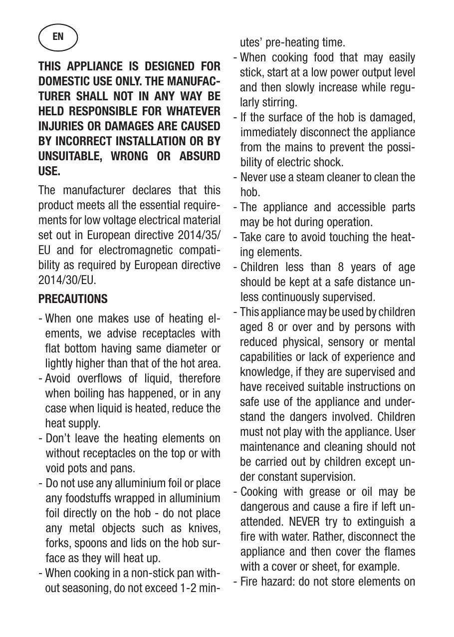 - Do not use any alluminium foil or place any foodstuffs wrapped in alluminium foil directly on the hob - do not place any metal objects such as knives, forks, spoons and lids on the hob sur- face as they will heat up.