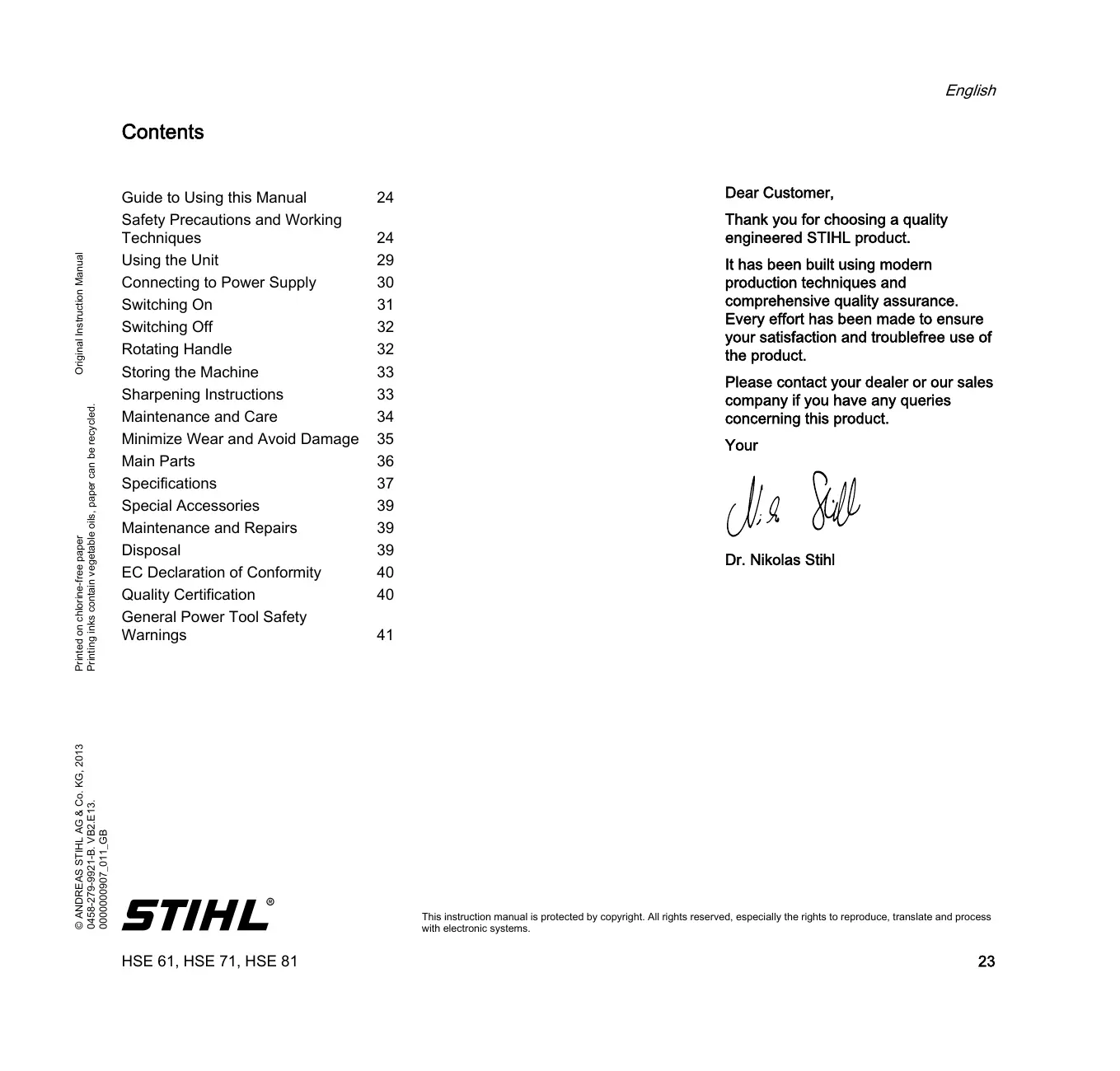 English Dear Customer, Thank you for choosing a quality engineered STIHL product. It has been built using modern production techniques and comprehensive quality assurance. Every effort has been made to ensure your satisfaction and troublefree use of the product. Please contact your dealer or our sales company if you have any queries concerning this product. Your
