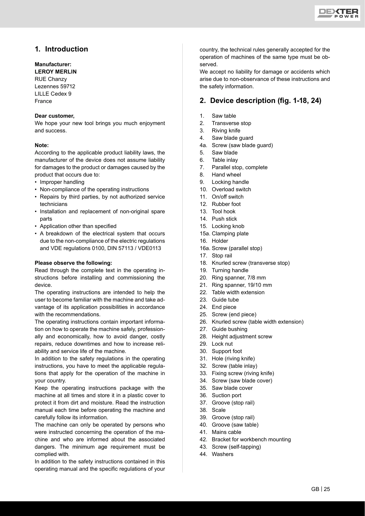 Manufacturer: LEROY MERLIN RUE Chanzy Lezennes 59712 LILLE Cedex 9 France Dear customer, We hope your new tool brings you much enjoyment and success. Note: According to the applicable product liability laws, the manufacturer of the device does not assume liability for damages to the product or damages caused by the product that occurs due to: +_Improper handling Non-compliance of the operating instructions Repairs by third parties, by not authorized service technicians Installation and replacement of non-original spare parts Application other than specified A breakdown of the electrical system that occurs due to the non-compliance of the electric regulations and VDE regulations 0100, DIN 57113 / VDE0113 Please observe the following: Read through the complete text in the operating in- structions before installing and commissioning the device. The operating instructions are intended to help the user to become familiar with the machine and take ad- vantage of its application possibilities in accordance with the recommendations. The operating instructions contain important informa- tion on how to operate the machine safely, profession- ally and economically, how to avoid danger, costly repairs, reduce downtimes and how to increase reli- ability and service life of the machine. In addition to the safety regulations in the operating instructions, you have to meet the applicable regula- tions that apply for the operation of the machine in your country. Keep the operating instructions package with the machine at all times and store it in a plastic cover to protect it from dirt and moisture. Read the instruction manual each time before operating the machine and carefully follow its information. The machine can only be operated by persons who were instructed concerning the operation of the ma- chine and who are informed about the associated dangers. The minimum age requirement must be complied with. In addition to the safety instructions contained in this operating manual and the specific regulations of your country, the technical rules generally accepted for the operation of machines of the same type must be ob- serv ed. We accept no liability for damage or accidents which arise due to non-observance of these instructions and the safety information.
