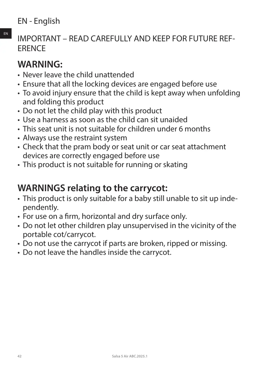 + Avant de franchir des marches ou des escaliers, de soulever ou de porter votre poussette, sor- tez toujours votre enfant de la poussette.