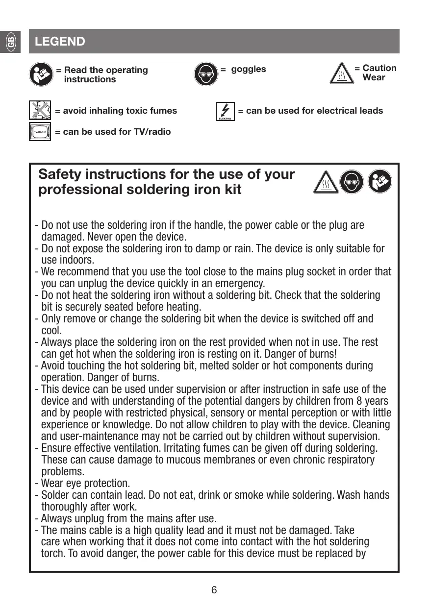 - Le fil de brasage peut contenir du plomb. Ne pas manger, boire ou fumer pendant le brasage. Impérativement se laver soigneusement les mains après le travail !