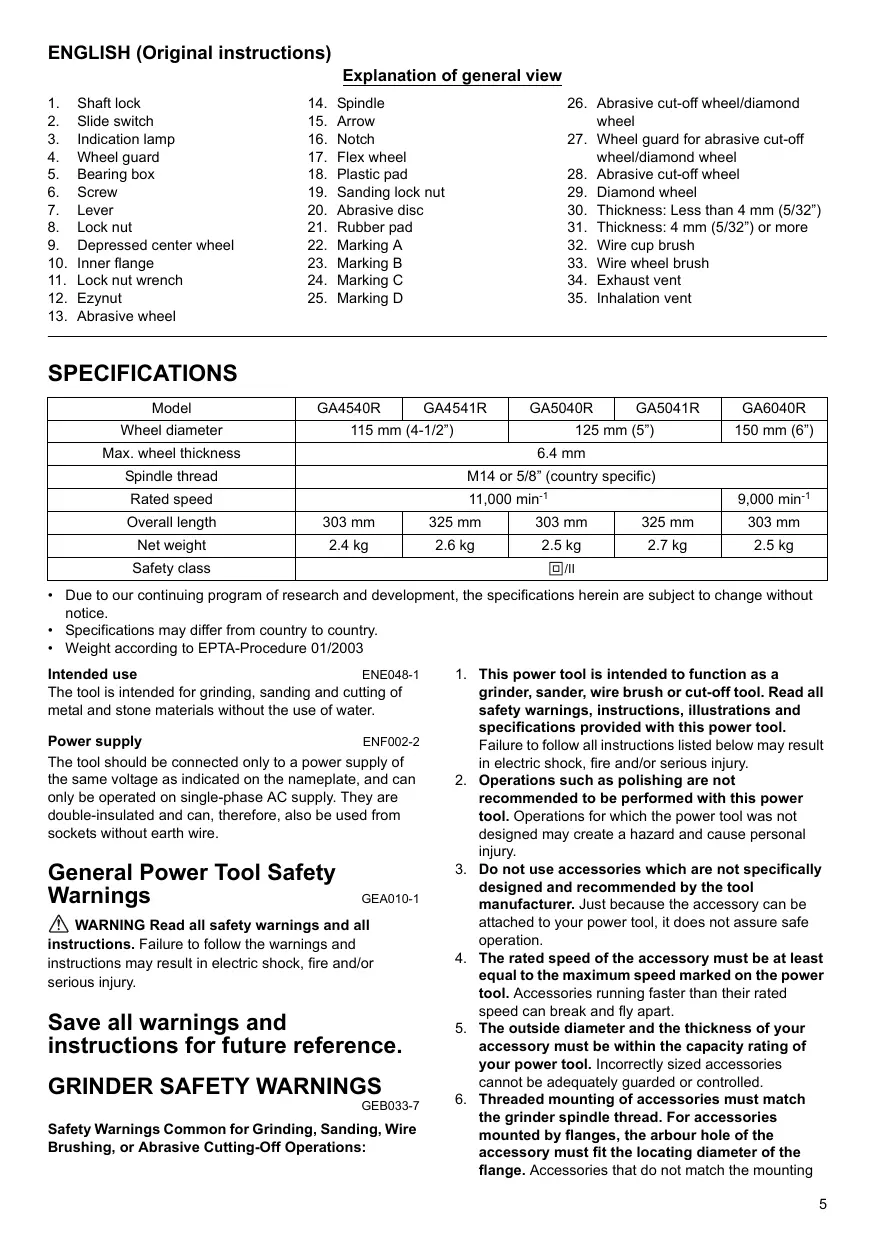 GA5040R - Meuleuse filaire MAKITA - Free user manual and instructions