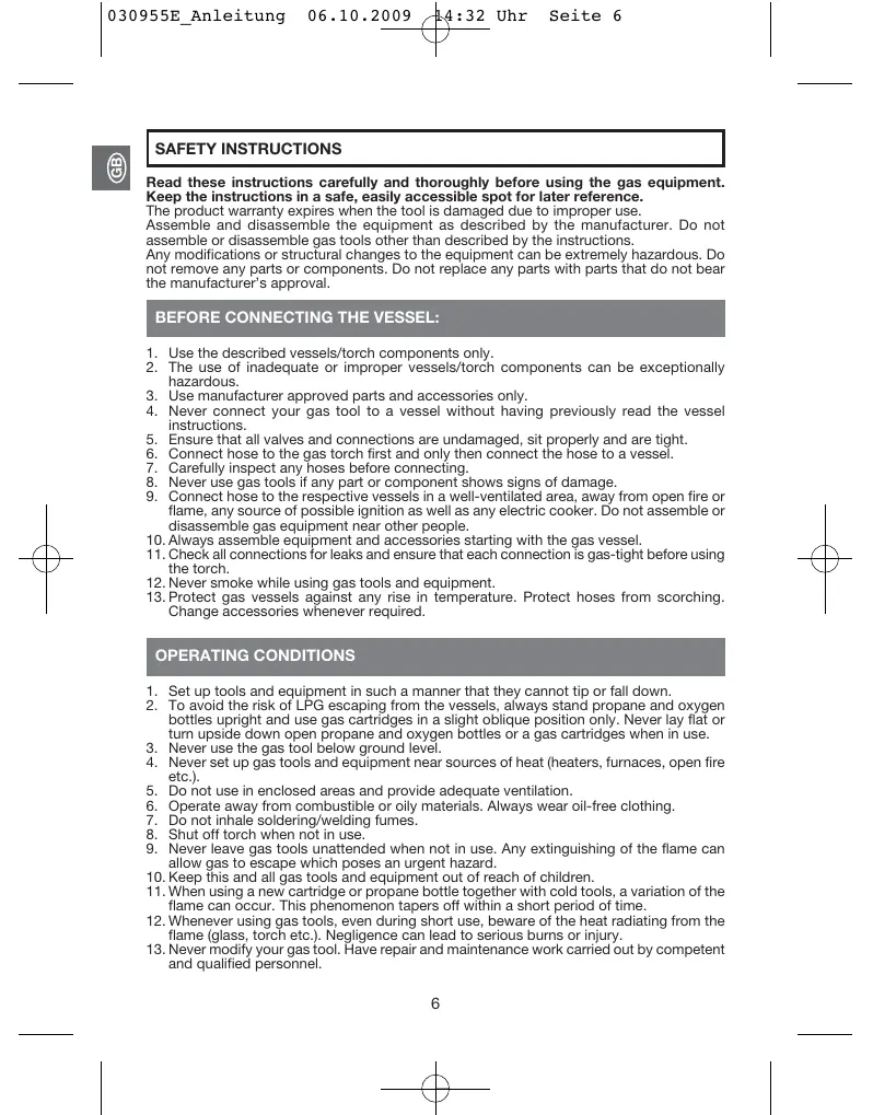 030955E Anleitung 06.10.2009 ds Uhr Seite 8 IGNITING AND ADJUSTING THE TORCH:
