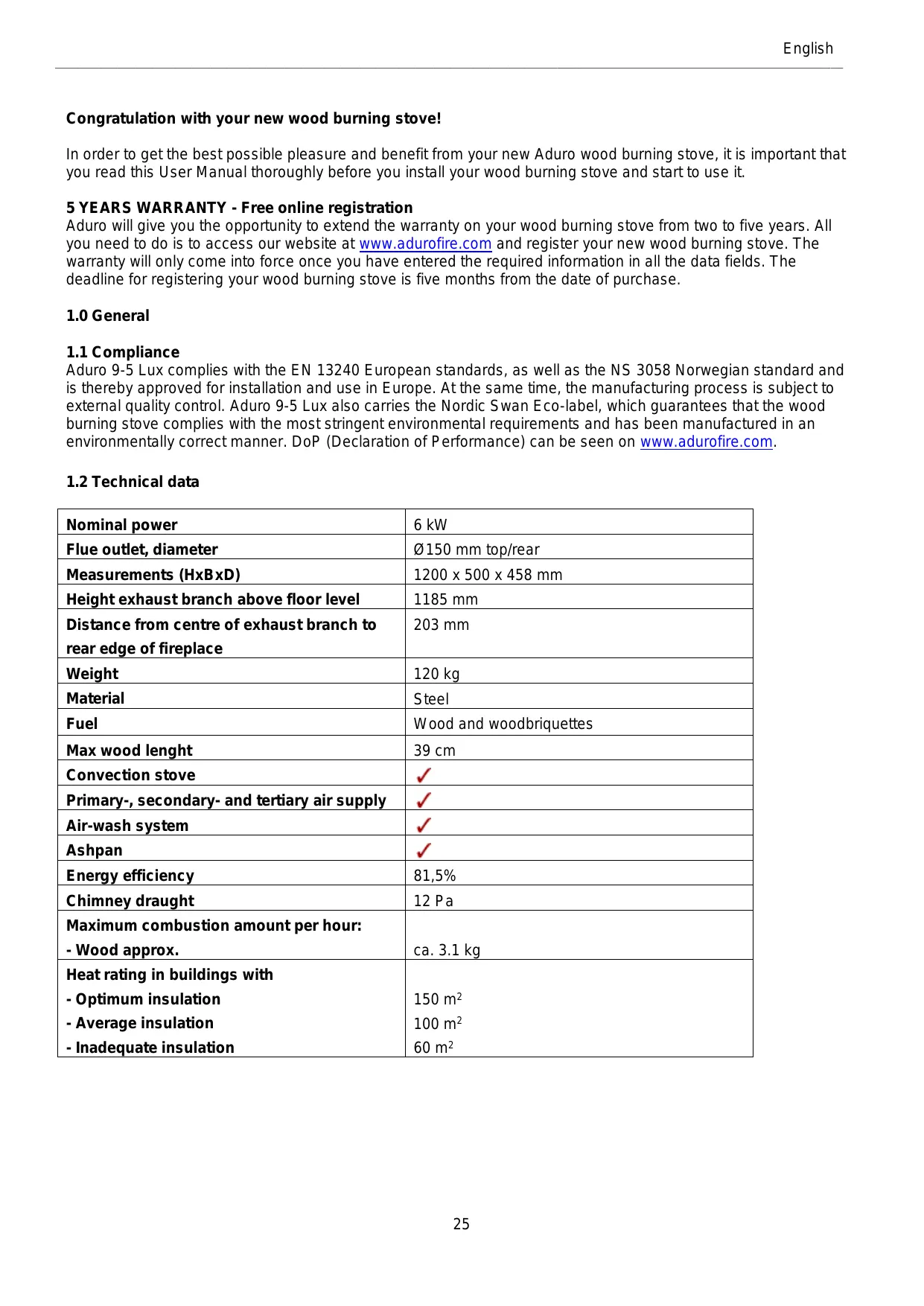 Aduro vous donne la possibilité de prolonger la garantie mentionnée ci-dessus de deux à cinq ans. Il vous suffit de visiter notre site internet: www.aduro.fr et d'enregistrer votre nouveau poêle à bois sur notre base de données pour la garantie. La garantie entrera en vigueur dès que vous aurez rempli tous les champs de données. Le délai pour l'enregistrement de votre poêle à bois est de 5 mois après votre achat.