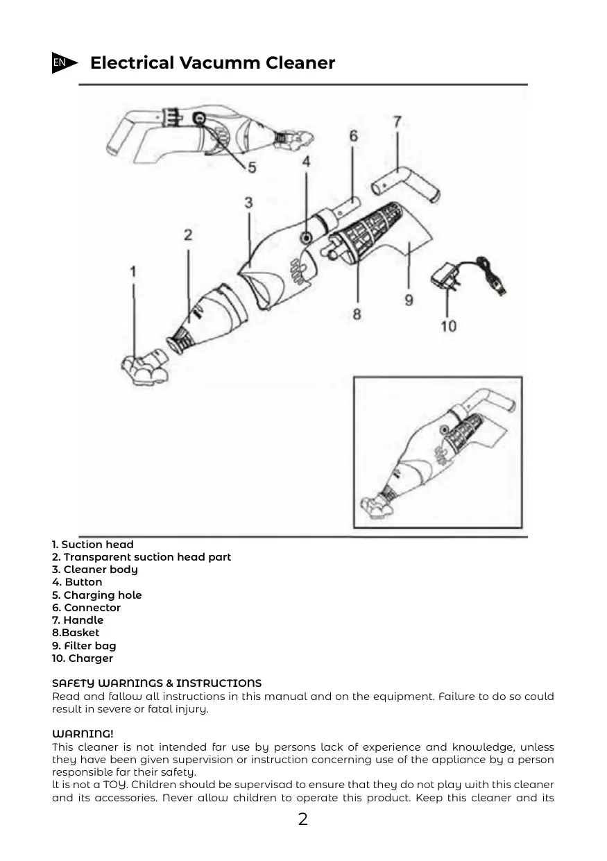 NE pas manipuleo l'aspirateur, le chargeur en charge avec les mains mouillées et sans chaussures.