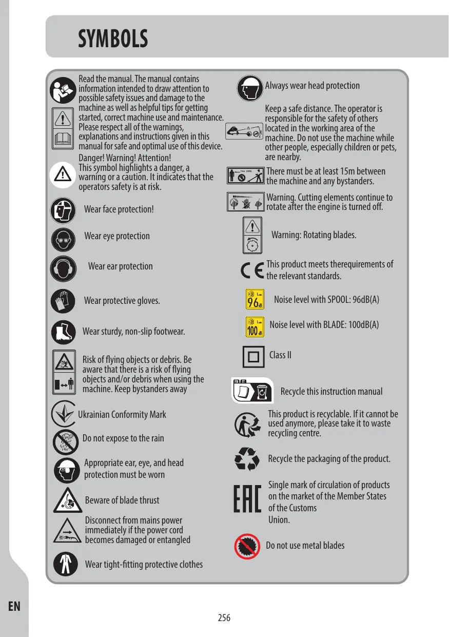 obE© Risk of flying objects or debris. Be aware that there is a risk of flying objects and/or debris when using the machine. Keep bystanders away Ukrainian Conformity Mark Do not expose to the rain Appropriate ear, eye, and head protection must be worn Beware of blade trust Disconnect from mains power immediately ifthe power cord becomes damaged or entangled Wear tight-fitting protective clothes