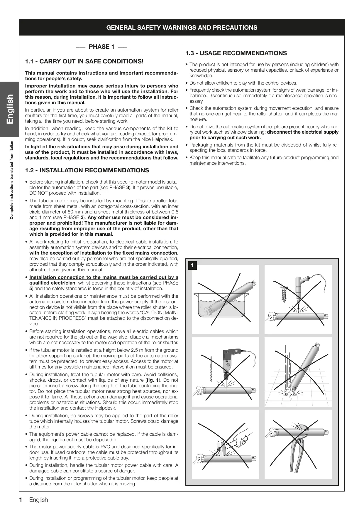 During installation, treat the tubular motor with care. Avoid collisions, shocks, drops, or contact with liquids of any nature (fig. 1). Do not pierce or insert a screw along the length of the tube containing the mo- tor. Do not place the tubular motor near strong heat sources, nor ex- pose it to flame. Al these actions can damage it and cause operational problems or hazardous situations. Should this occur, immediately stop the installation and contact the Helpdesk.