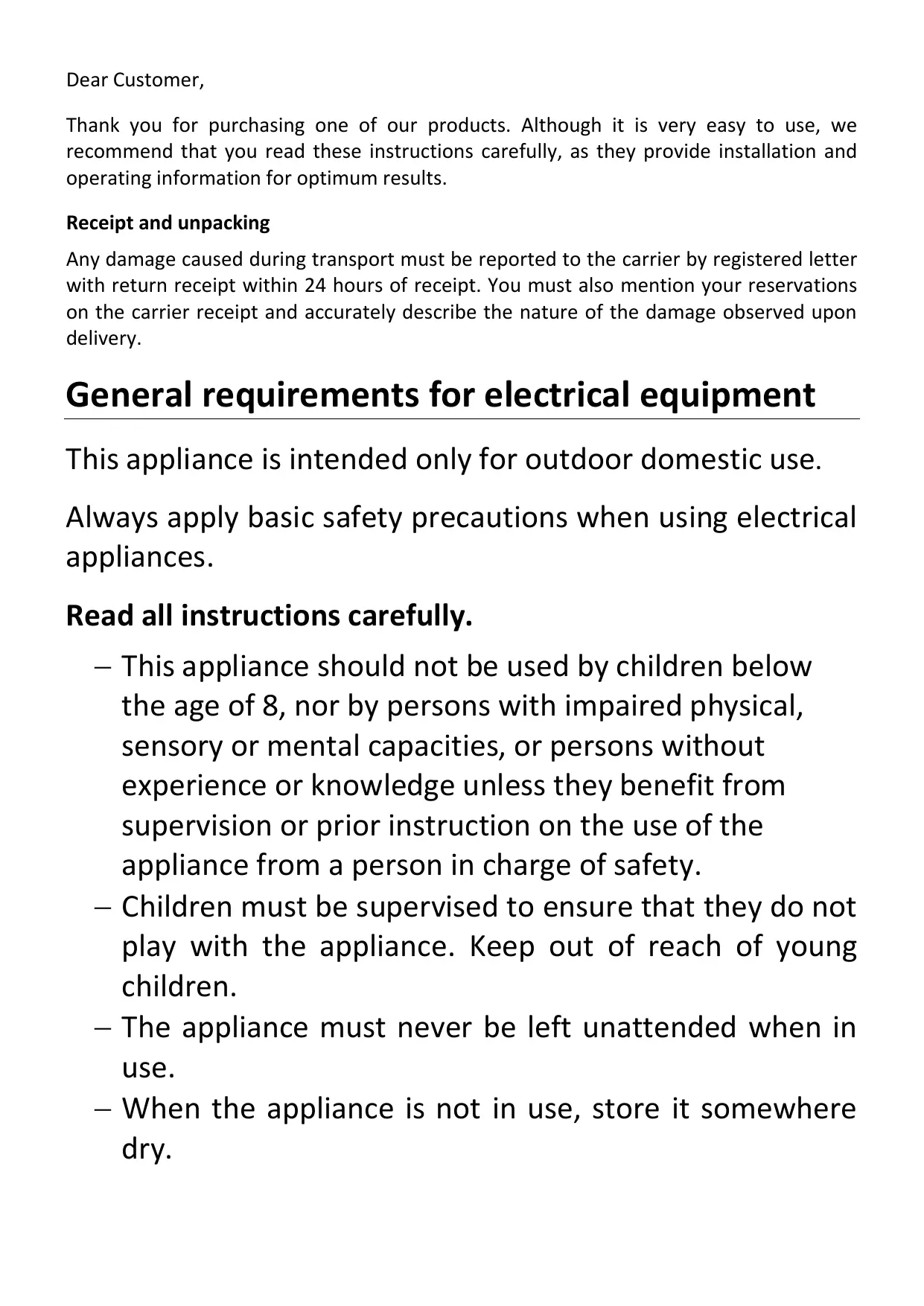 Les dommages éventuels dus au transport doivent être signalés au transporteur par lettre recommandée avec AR dans les 24 heures suivant la réception. Vous devez également faire mention de vos réserves sur le récépissé du transporteur et décrire avec précision les dégâts constatés à la livraison.