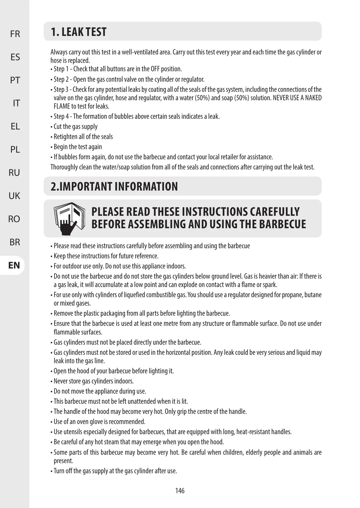 + Avant d'utiliser votre barbecue faîtes un test de fuite. C'est le seul moyen fiable de détecter une fuite de gaz sur les joints ou les connexions après le montage.