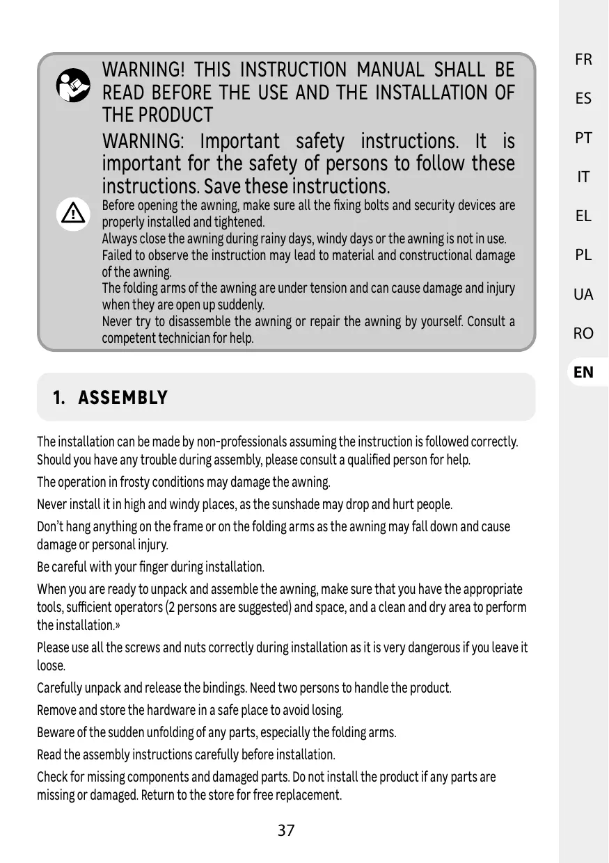 1. MONTAGE L'installation peut être effectuée par des personnes non professionnelles à condition que Les instructions soient correctement suivies. En cas de problème au cours de l'assemblage du store, veuillez faire appel à une personne qualifiée pour obtenir de l'assistance.