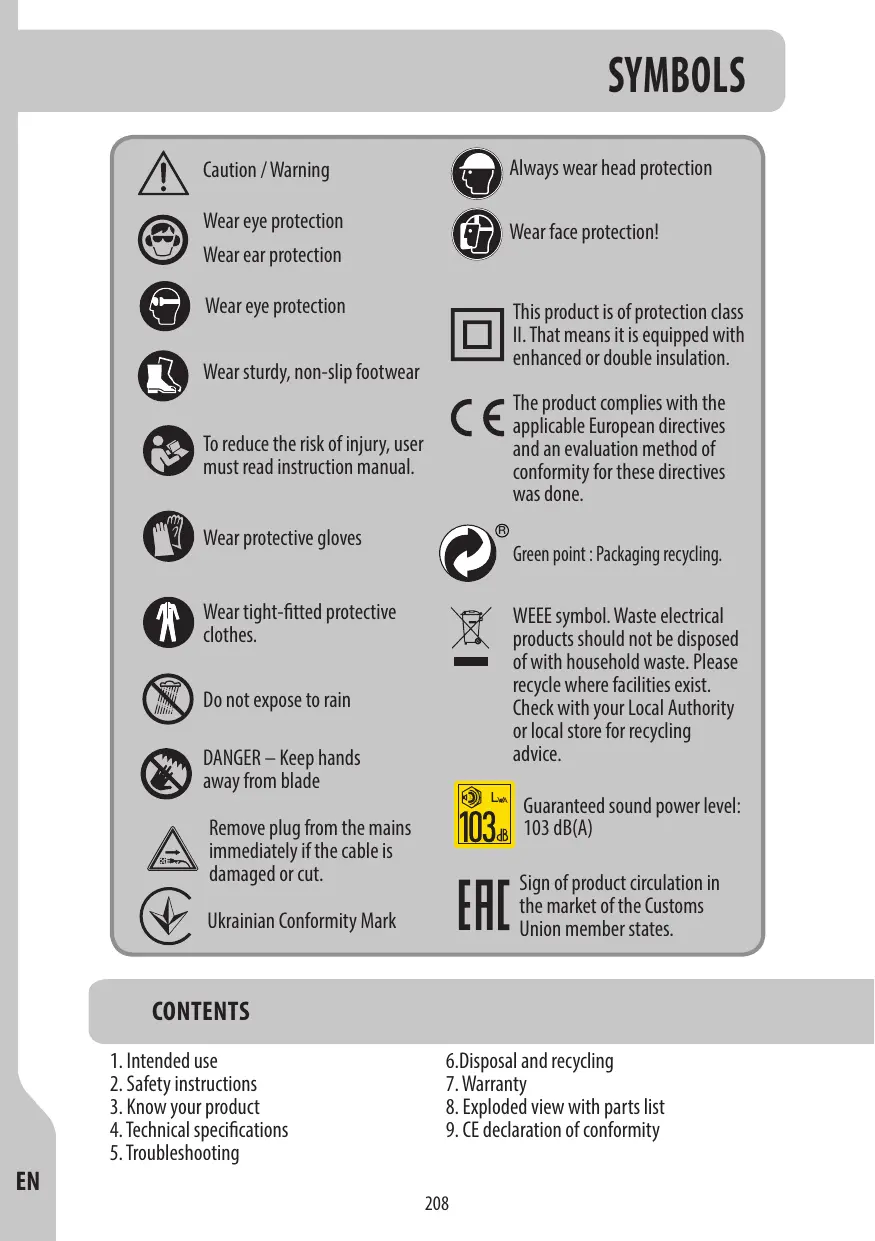 CONTENTS 1. Intended use 6.Disposal and recycling 2. Safety instructions 7. Warranty 3. Know your product 8. Exploded view with parts list 4. Technical specifications 9. CE declaration of conformity