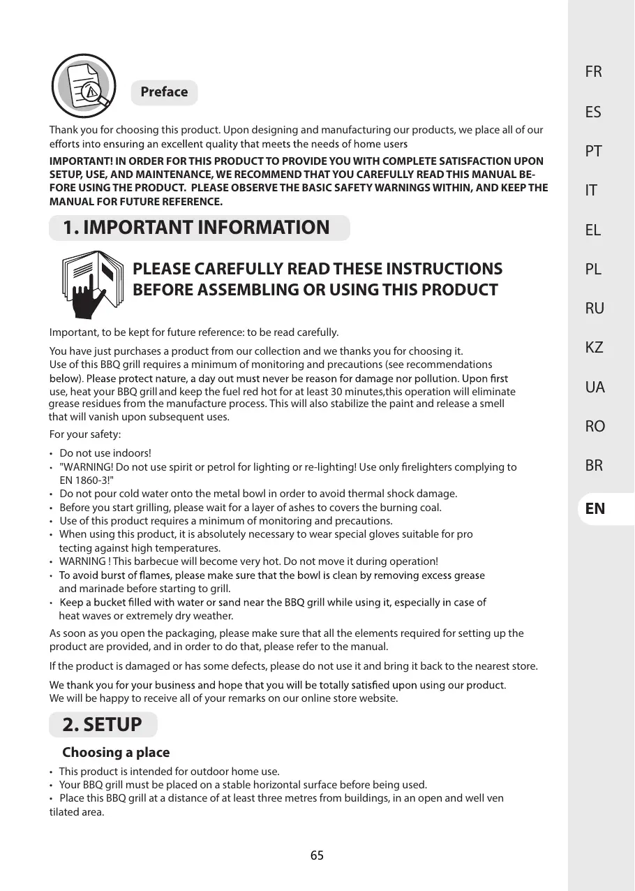 Utiliser ce barbecue requiert un minimum de surveillance et de précautions (voir les recommandations ci-après). Merci de protéger la nature, une journée à l'extérieur ne doit pas engendrer des dommages ou de la pollution. Lors de la première utilisation, faites chauffer votre barbecue et maintenez le combustible au rouge pendant au moins 30 minutes, cela permet d'éliminer les résidus de graisse laissés lors de la fabrication. Cela permet aussi de stabiliser la peinture et de dégager une odeur qui disparaîtra au fil des utilisations.