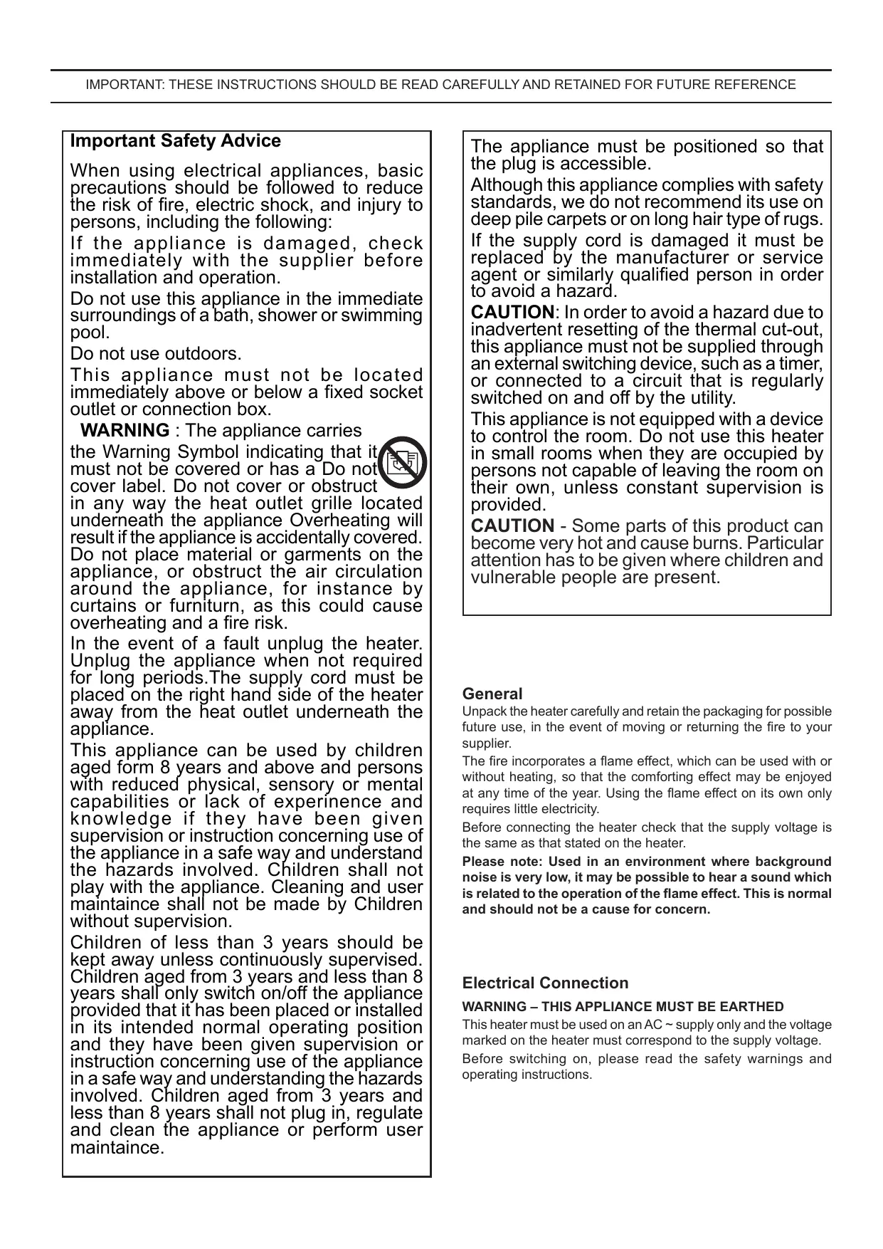 Une surchauffe surviendrait si l'appareil était accidentellement couvert. Ne pas placer de matériaux ou de vêtements sur l'appareil de chauffage ou entraver la circulation d’air autour de l'appareil avec des rideaux ou des meubles par exemple, car ceci est susceptible de causer une surchauffe et un risque d'incendie.