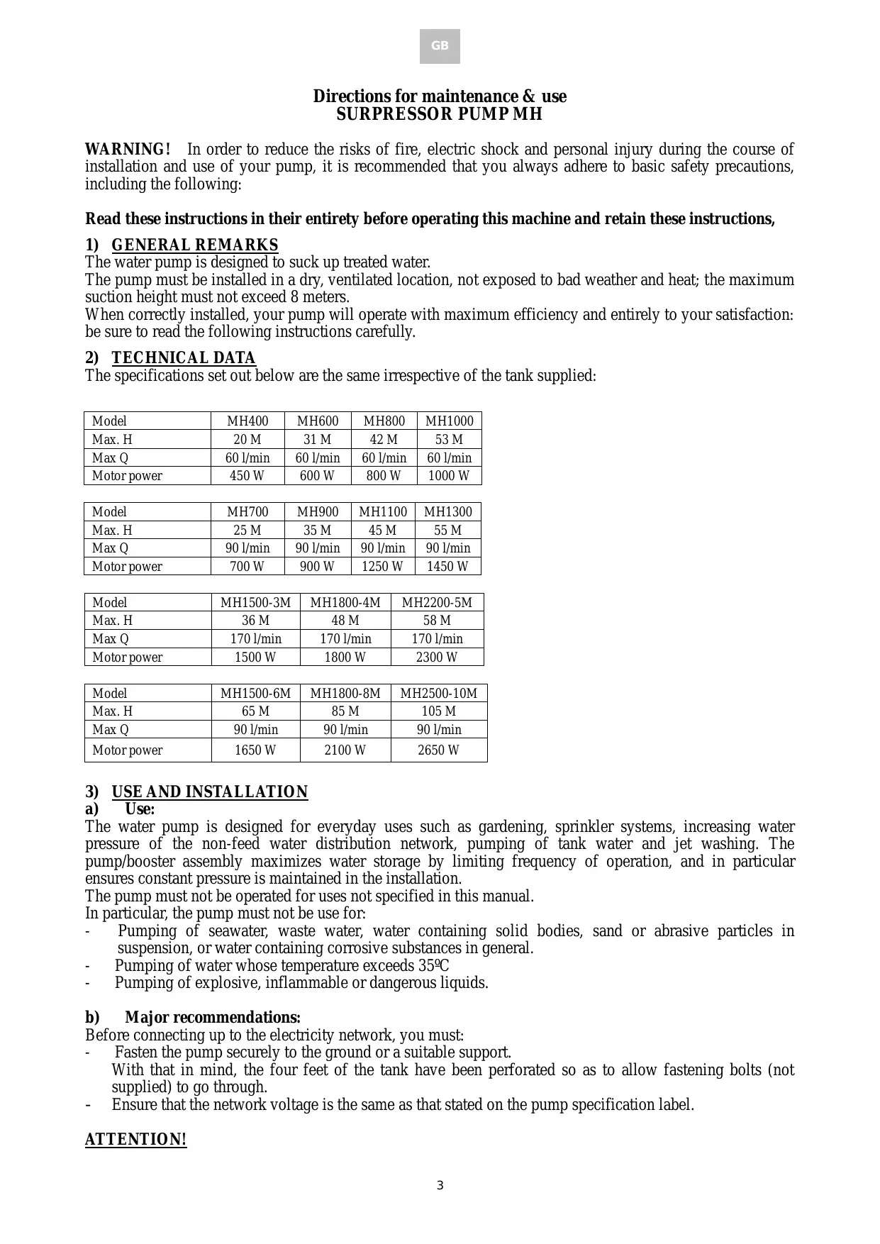 Directions for maintenance & use SURPRESSOR PUMP MH