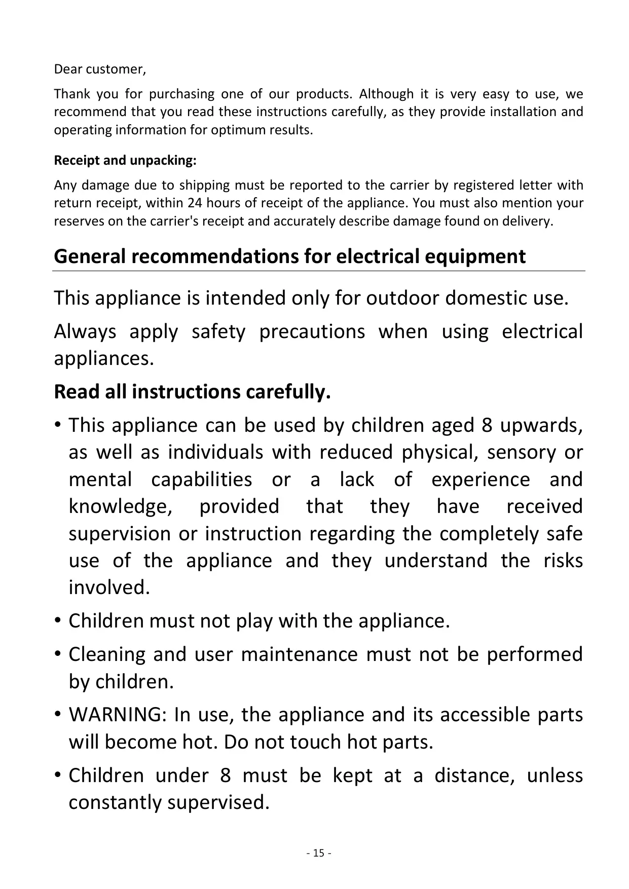 Warning: do not use this appliance with charcoal or any other power source than the one for which it is intended (electric power).