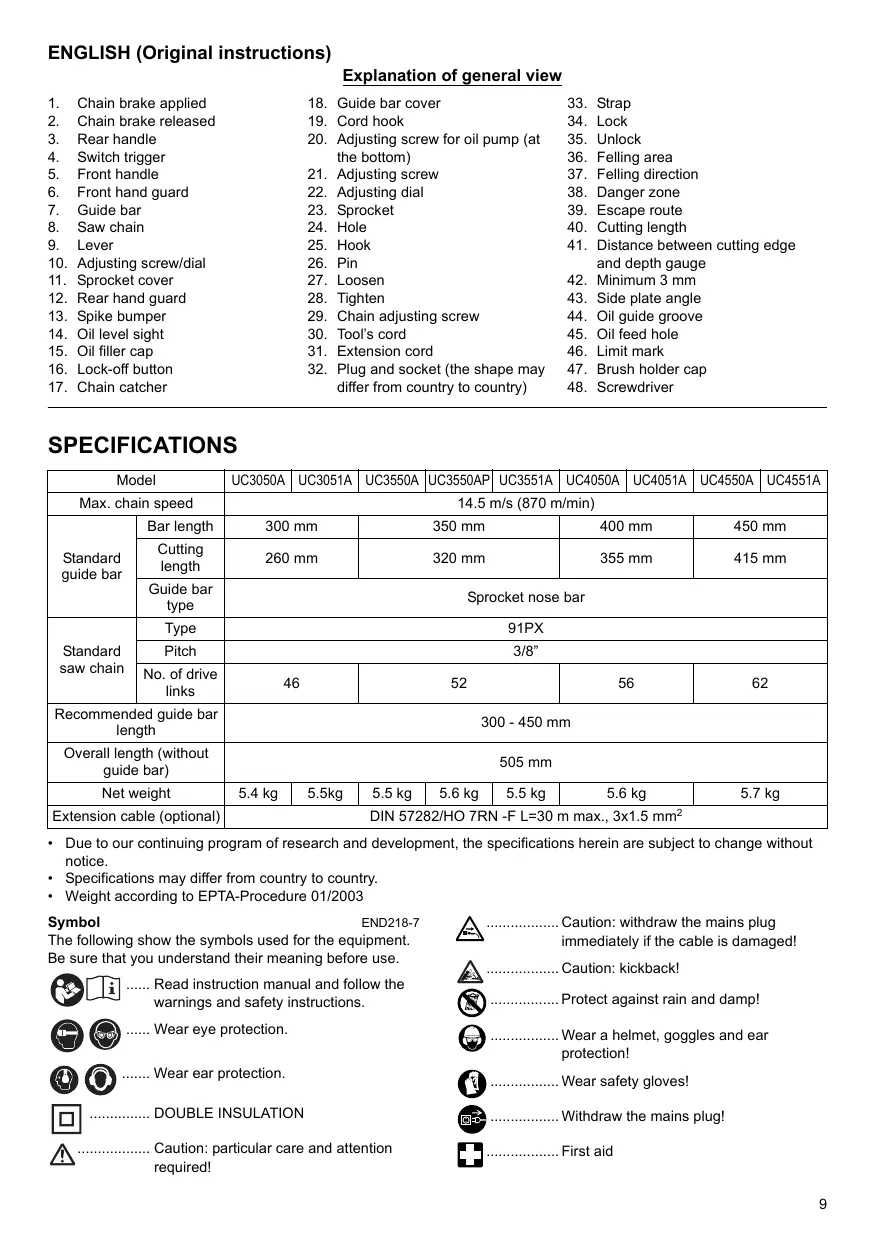 1. Chain brake applied 18. Guide bar cover 33. Strap 2. Chain brake released 19. Cord hook 34. Lock 3. Rear handle 20. Adjusting screw for oil pump {at 35. Unlock 4. Switch trigger the bottom) 36. Feling area 5. Front handle 21. Adjusting screw 37. Felling direction 6. Front hand guard 22. Adjusting dial 38. Danger zone 7. Guide bar 23. Sprocket 39. Escape route 8. Saw chain 24. Hole 40. Cutting length 9. Lever 25. Hook 41. Distance between cutting edge 10. Adjusting screw/dial 26. Pin and depth gauge 11. Sprocket cover 27. Loosen 42. Minimum 3 mm 12. Rear hand guard 28. Tighten 43. Side plate angle 13. Spike bumper 29. Chain adjusting screw 44. Oil guide groove 14. Oil level sight 30. Tools cord 45. Oil feed hole 15. Oil filer cap 31. Extension cord 46. Limit mark 16. Lock-off button 32. Plug and socket (the shape may 47. Brush holder cap 17. Chain catcher differ from country to country) 48. Screwdriver SPECIFICATIONS Model UC3050 [ UC3051A | UC3550A JUC3550AP] UC3551A | UCAOSOA | UCAOS!A | UCA5S0A | UCASSTA Max. chain speed 14.5 ms (870 m/min) Bar length 300 mm 350 mm 400 mm 450 mm Standard ca 260 mm 320 mm 355 mm 415 mm guide bar 9 Guide bar Sprocket nose bar type pi Type SIPX Standard Pitch ET saw chain No. of drive ins 46 52 56 62 Recommended guide bar length 300 - 450 mm Overall length (without guide bar) Lu Net weight 54kg | 55kg | 55kg | 56k9 [| 55K | 5.6kg 5.7 kg Extension cable (optional) DIN 57282/HO 7RN -F L=30 m max, 3x1.5 mm?