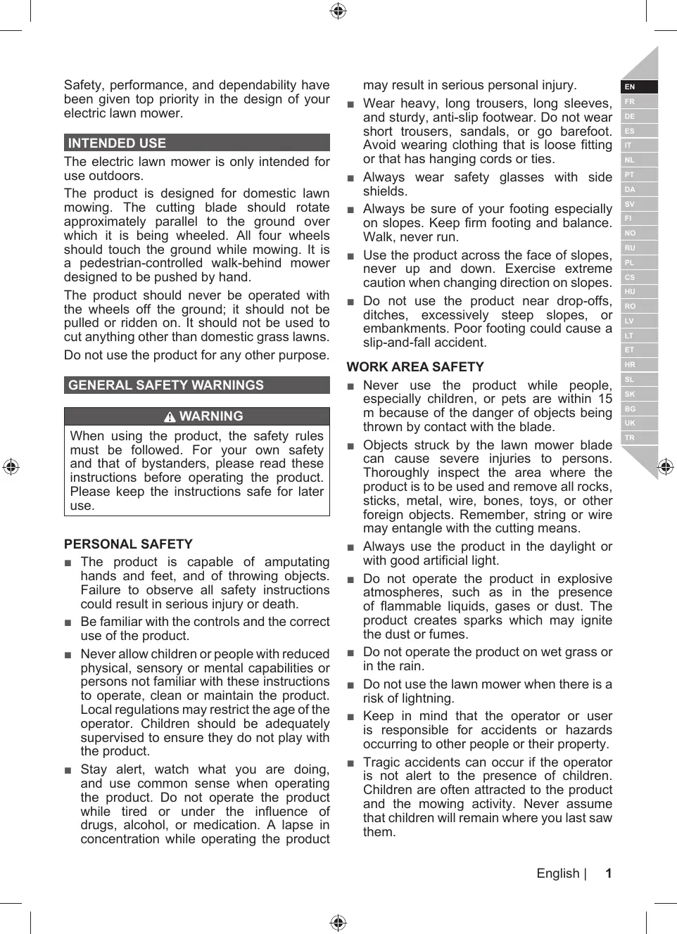 = La tondeuse à gazon est capable d'amputer les mains et les pieds, ainsi que de projeter des objets. Le non-respect de toutes les règles de sécurité est susceptible d'entraîner des blessures graves voire mortelles.
