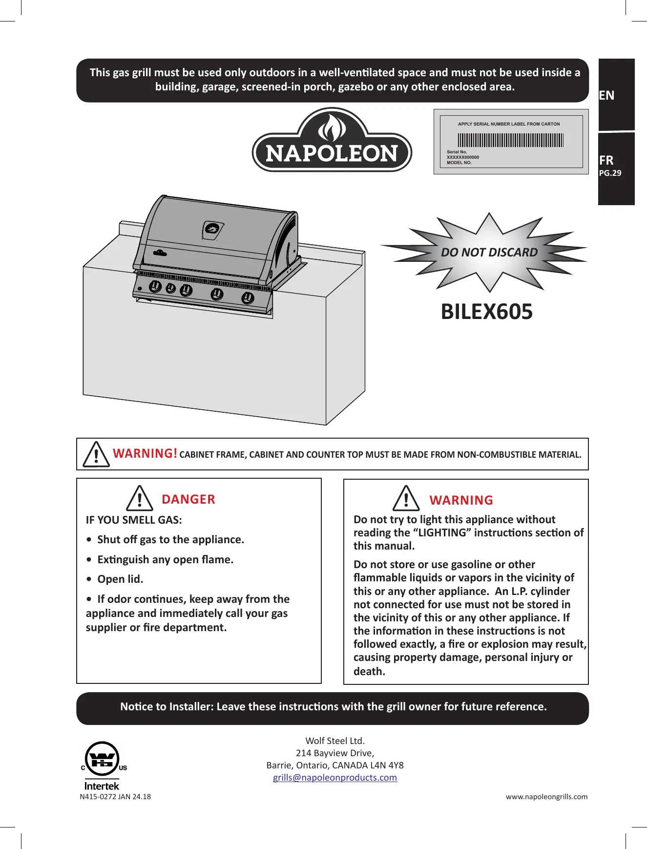 Wolf Steel Ltd. 214 Bayview Drive, Barrie, Ontario, CANADA LAN 4Y8 grills@napoleonproducts.com
