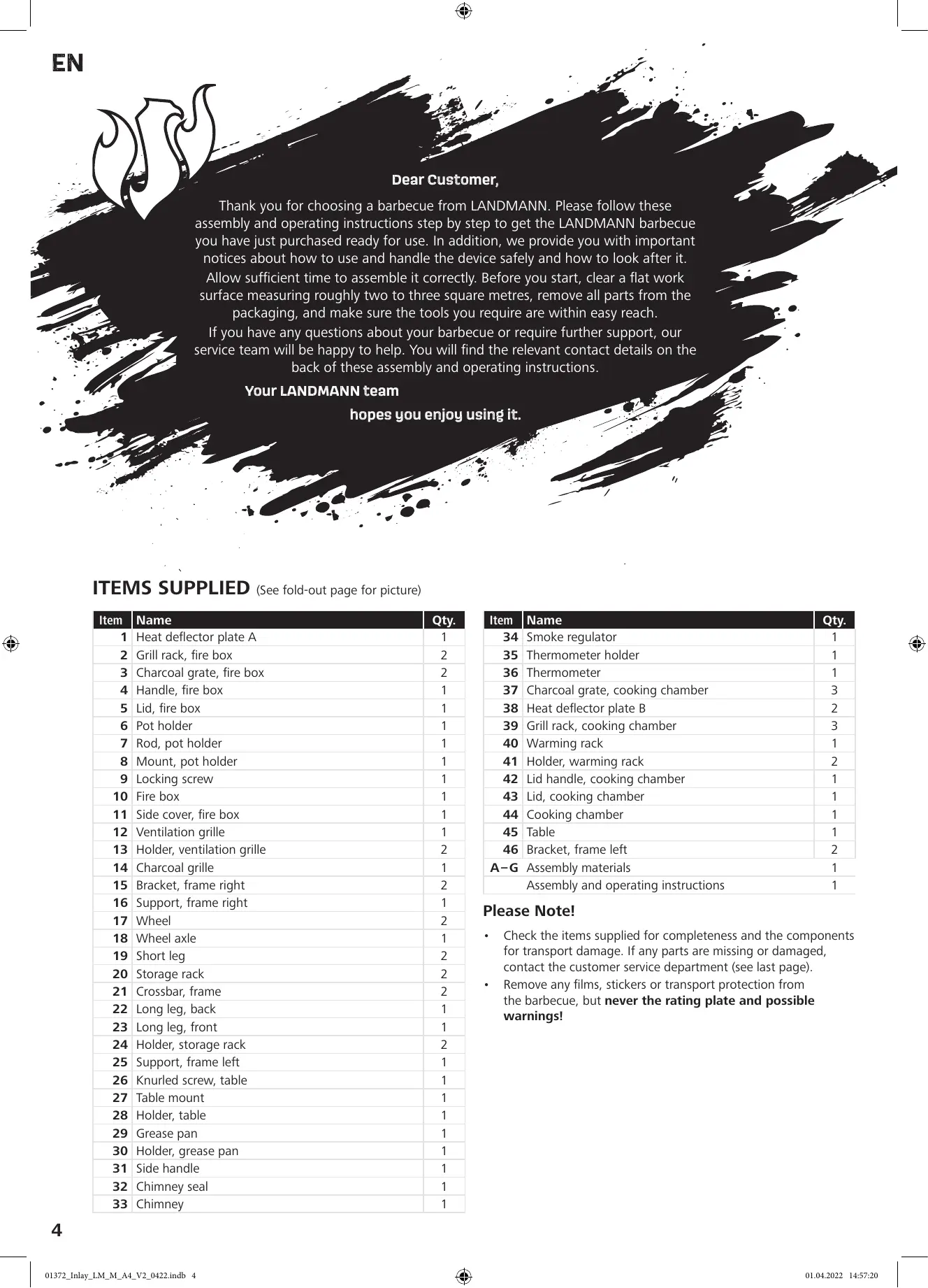 7 Tige, potence pour marmite 41 Support, grille de maintien au chaud 2 8 Logement, potence pour marmite 42 Poignée du couvercle, chambre de cuisson 1 9 Vis de fixation 43 Couvercle, chambre de cuisson 1 10 Boîte de combustion 44 Chambre de cuisson 1 11 Cache latéral, boîte de combustion 45 Tablette 1 12 Grille de ventilation 46 Coude, bâti à gauche 2 13 Support, grille de ventilation A-G Matériel de montage 1 14 Grille de retenue de charbon Guide de montage et d'utilisation 1 15 Coude, bâti à droite À . 16 Montant, bâti à droite À observer : 17 Roue + Vérifiez que l'étendue des fournitures est au complet et que les 18 Essieu composants ne présentent pas de dommages imputables au