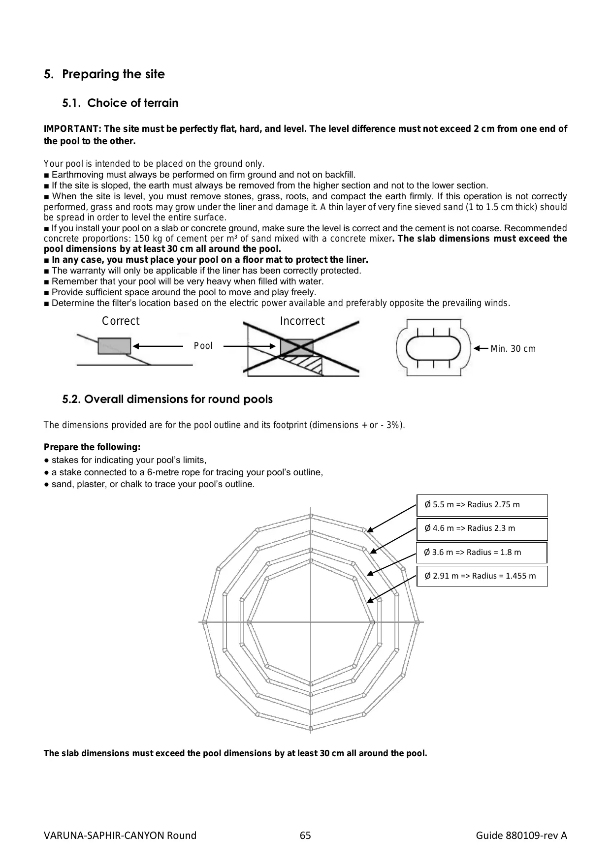 = If you install your pool on a slab or concrete ground, make sure the level is correct and the cement is not coarse. Recommended concrete proportions: 150 kg of cement per m° of sand mixed with a concrete mixer. The slab dimensions must exceed the pool dimensions by at least 30 cm all around the pool.