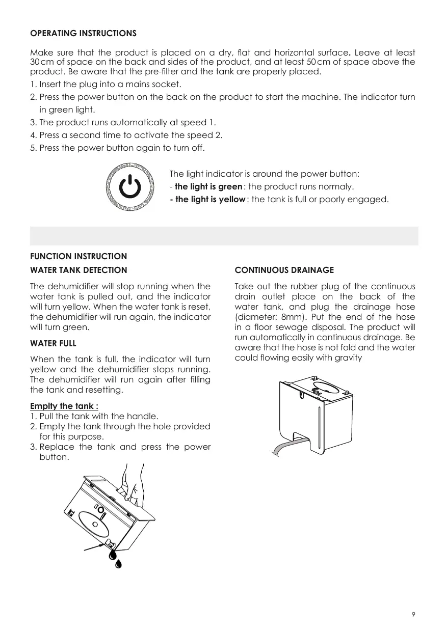 RÉSERVOIR PLEIN La couleur jaune de l'indicateur vous indique que le réservoir est plein. Dans ce cas le déshumidificateur s'arrête. Videz le bac et repositionnez- le pour relancer sa mise en marche.