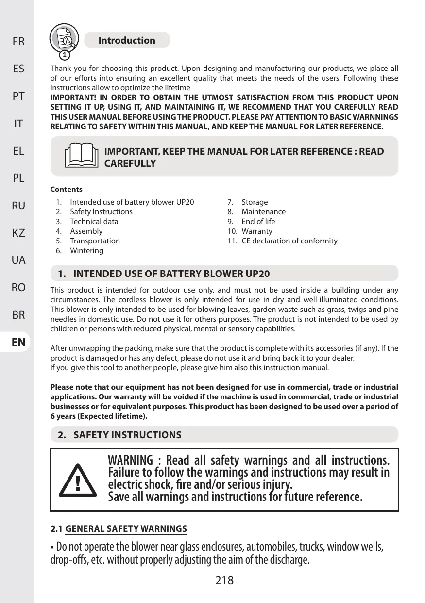 1. INTENDED USE OF BATTERY BLOWER UP20