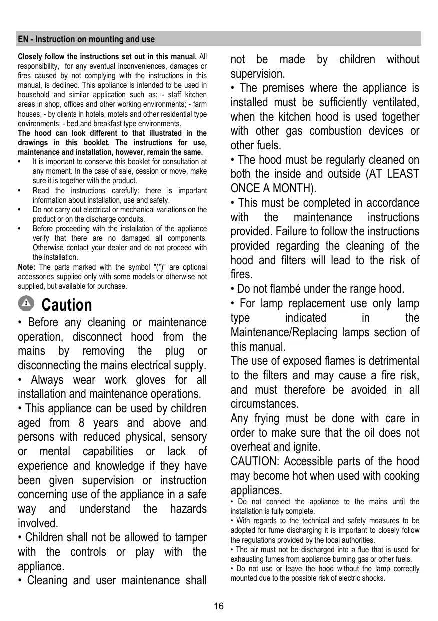 + La hotte ne doit JAMAIS être utilisée comme une surface d'appui, sauf indication expresse.