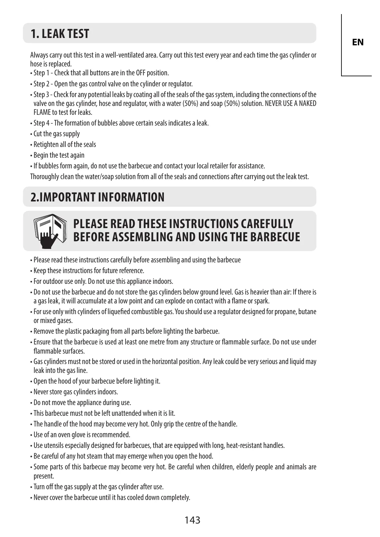 - Avant d'utiliser votre barbecue faîtes un test de fuite. C'est le seul moyen fiable de détecter une fuite de gaz sur les joints ou les connexions après le montage.