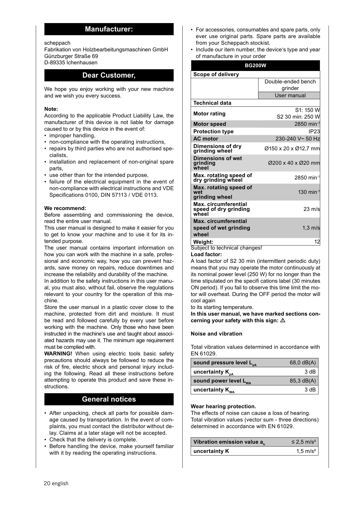 USER MANUAL BG200W SCHEPPACH