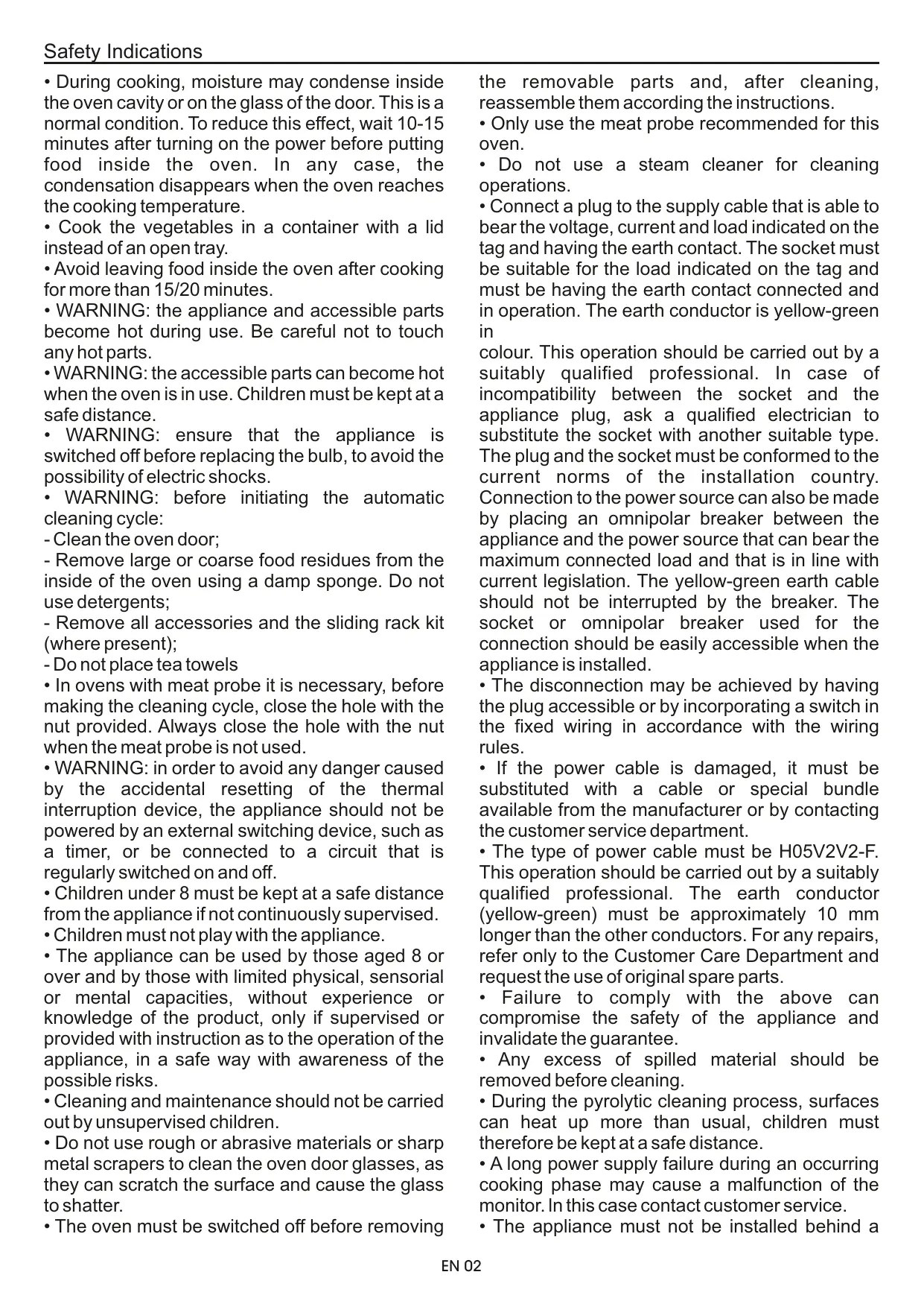 NOTE: as the oven could require maintenance work, itis advisable to keep another wall socket available so that the oven can be connected to this if it is removed from the space in which it is installed. The power cable must only be substituted by technical service staff or by technicians with equivalent qualifications.