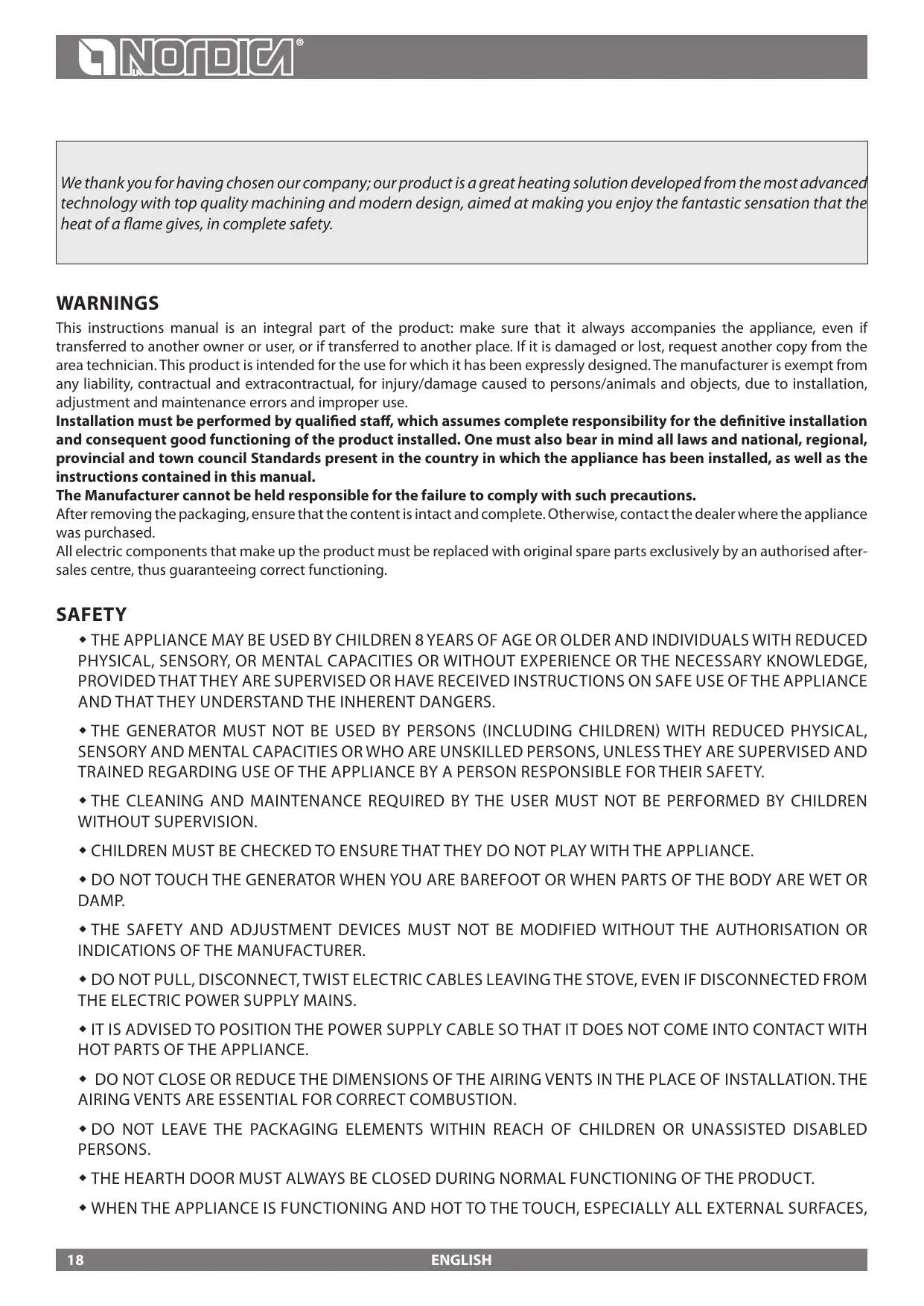 AVERTISSEMENTS GENERAUX La responsabilité de La société La NORDICA S.p.a. se limite à la fourniture de l'appareil.
