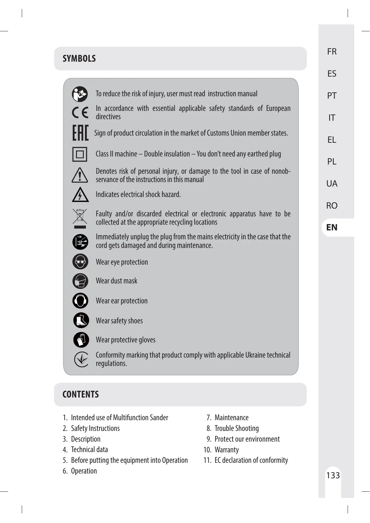 électrique. En cas de dommages, faire réparer l'outil électrique avant de IT l'utiliser. De nombreux accidents sont dus à des outils électriques mal entretenus. f) Garder affûtés et propres les outils permettant de couper. Des outils destinés à EL couper correctement entretenus avec des pièces coupantes tranchantes sont moins susceptibles de bloquer et sont plus faciles à contrôler. PL g) Utiliser l'outil électrique, les accessoires et les lames etc., conformément à ces instructions, en tenant compte des conditions de travail et du travail à UA réaliser. L'utilisation de l'outil électrique pour des opérations différentes de celles prévues peut donner lieu à des situations dangereuses. RO h) Il faut que les poignées et les surfaces de préhension restent sèches, propres et dépourvues d'huiles et de graisses. Des poignées et des surfaces de préhension EN