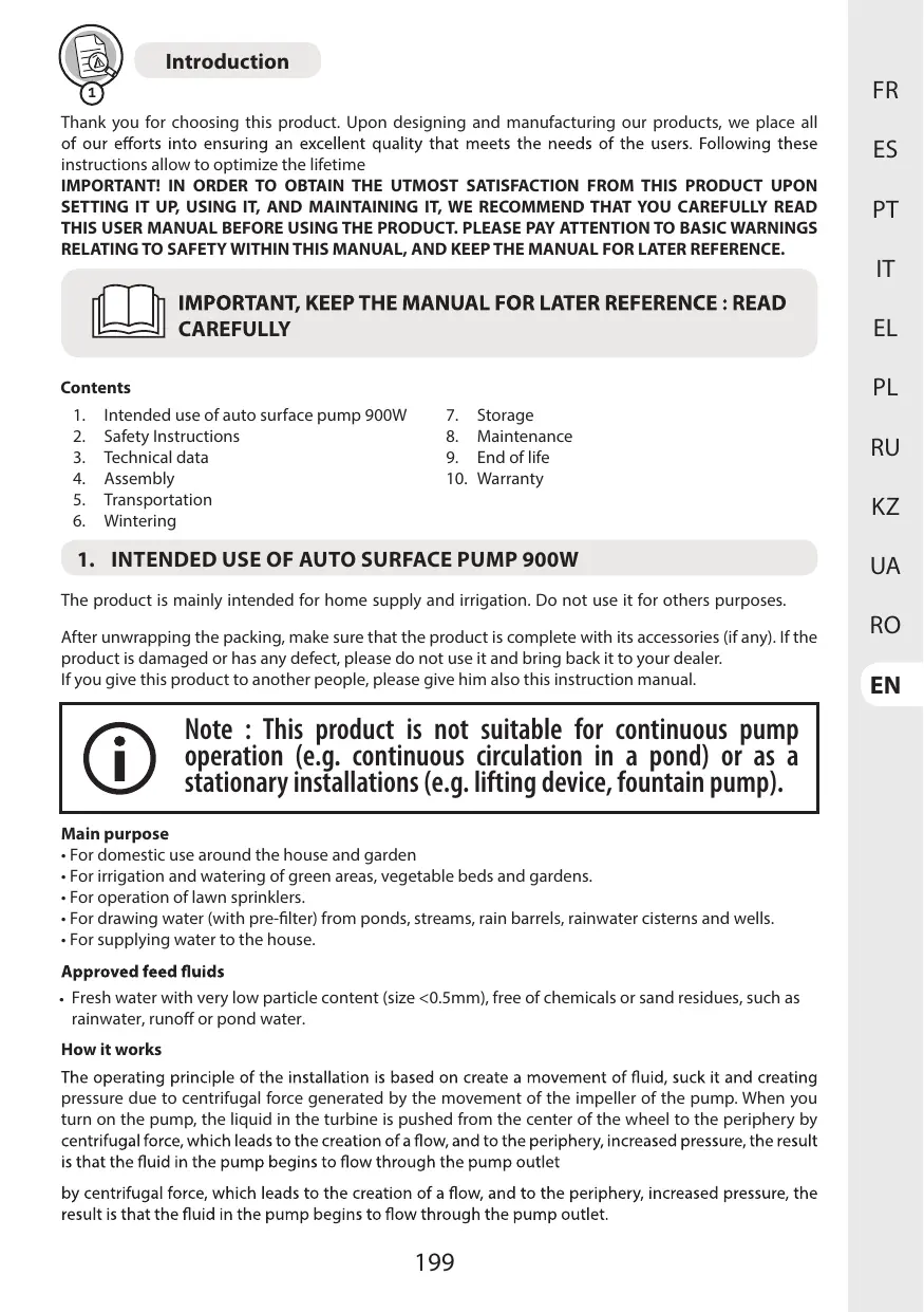 1. INTENDED USE OF AUTO SURFACE PUMP 900W The product is mainly intended for home supply and irrigation. Do not use it for others purposes.