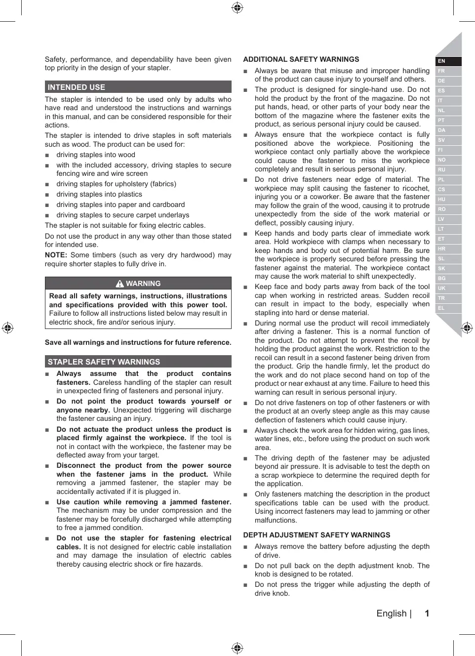 INTENDED USE The stapler is intended to be used only by adults who have read and understood the instructions and warnings in this manual, and can be considered responsible for their actions.