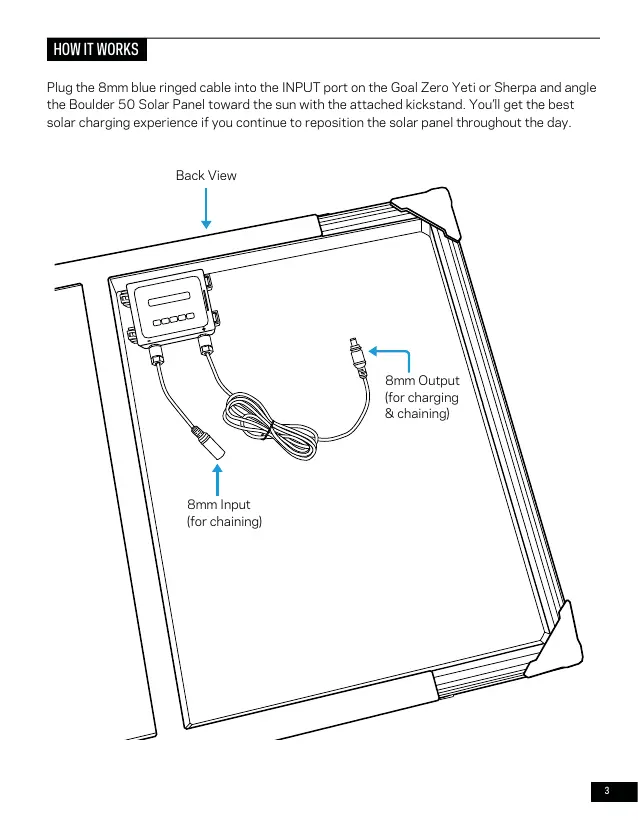 {input} de 8 mm, tel un autre Boulder 50 ou l'ancien modèle Boulder 30, en insérant le câble de 8 mm à anneau bleu du Boulder 50 dans l'entrée de 8 mm de l'autre panneau solaire Boulder. Lorsque vous connectez plusieurs panneaux solaires Boulder en série. dans une configuration dépassant les 150W/ vous devrez acheter un câble combinateur, vendu par Goal Zero. Veuillez appeler notre centre de solutions pour la clientèle afin de déterminer le meilleur câble pour votre installation.