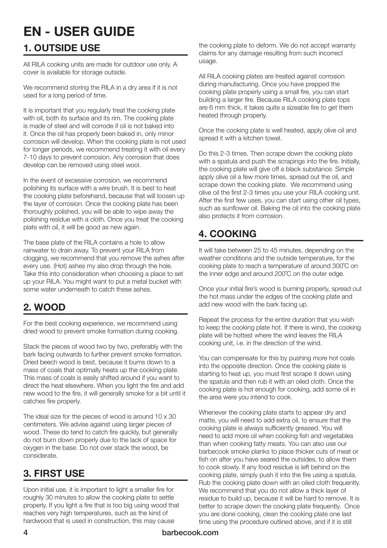 4. WARRANTY TERMS A 2-year warranty applies to the material and construction of all steel elements of all RILA cooking units. For proper registration of your RILA products please go to https:// www.barbecook.com/en/accounts/
