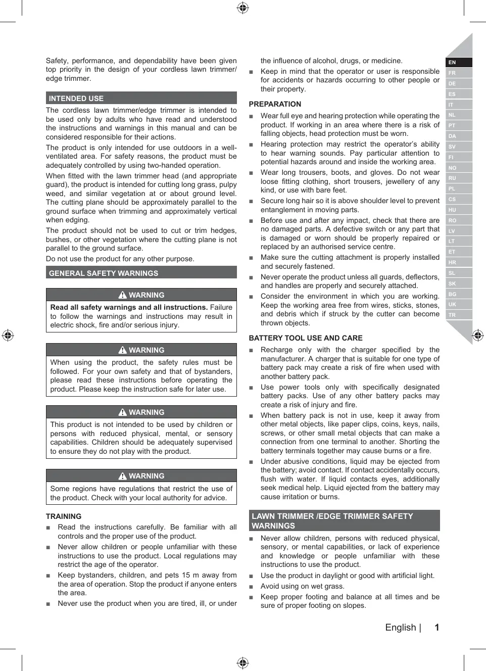 DE SÉCURITÉ CONCERNANT AZON/COUPE-BORDURE Ne laissez jamais les enfants, les personnes aux capacités physiques, sensorielles ou mentales réduites ou n'ayant pas l'habitude ou les connaissances suffisantes, ni les personnes non familiarisées avec ces instructions utiliser ce produit