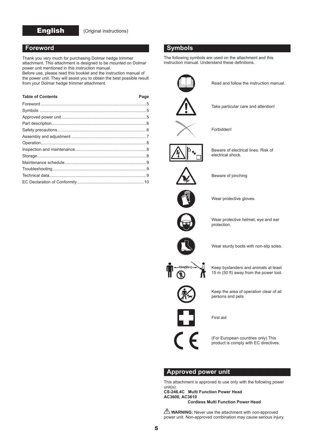 Thank you very much for purchasing Dolmar hedge trimmer attachment. This attachment is designed to be mounted on Dolmar power unit mentioned in this instruction manual.