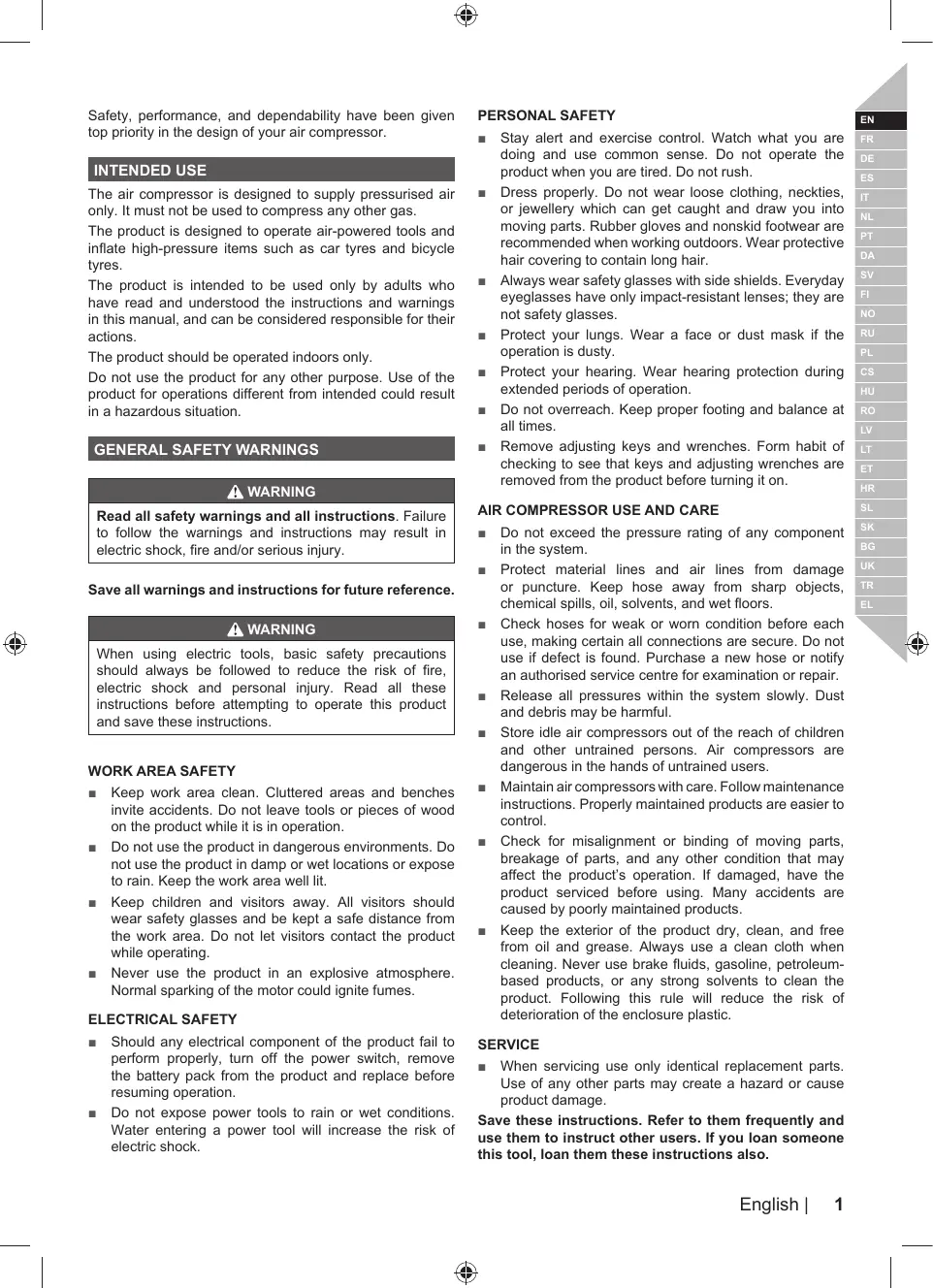 INTENDED USE The air compressor is designed to supply pressurised air only. It must not be used to compress any other gas.